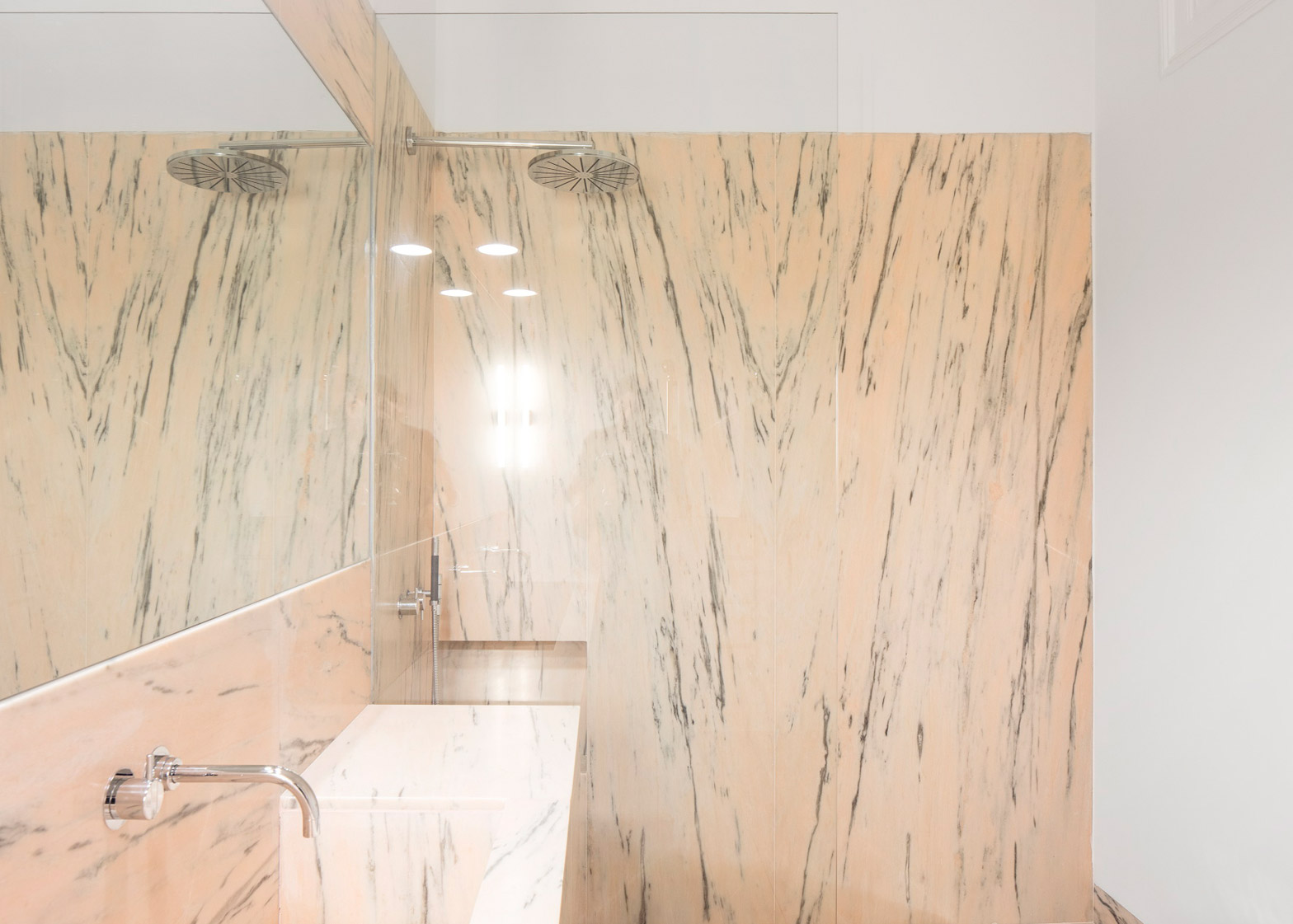 Raúl Sánchez-ს მიერ ბარსელონას ბინაში ნაცრისფერი ბეტონითა და მარმარილოთი შექმნილი ინტერიერი, სადაც მილსადენები თვალისთვის ხილვადია, მინიმალისტური დიზაინის საინტერესო ვარიანტია. 110 კვადრატულიანი ფართობის განაწილების მიზნით, სანჩესმა და მისმა სტუდიამ RAS Arquitectura გამოიყენეს დახრილი კედლები, რომლებიც ხელს უწყობენ ღია გეგმაში საინტერესო კუთხეების გაჩენას.