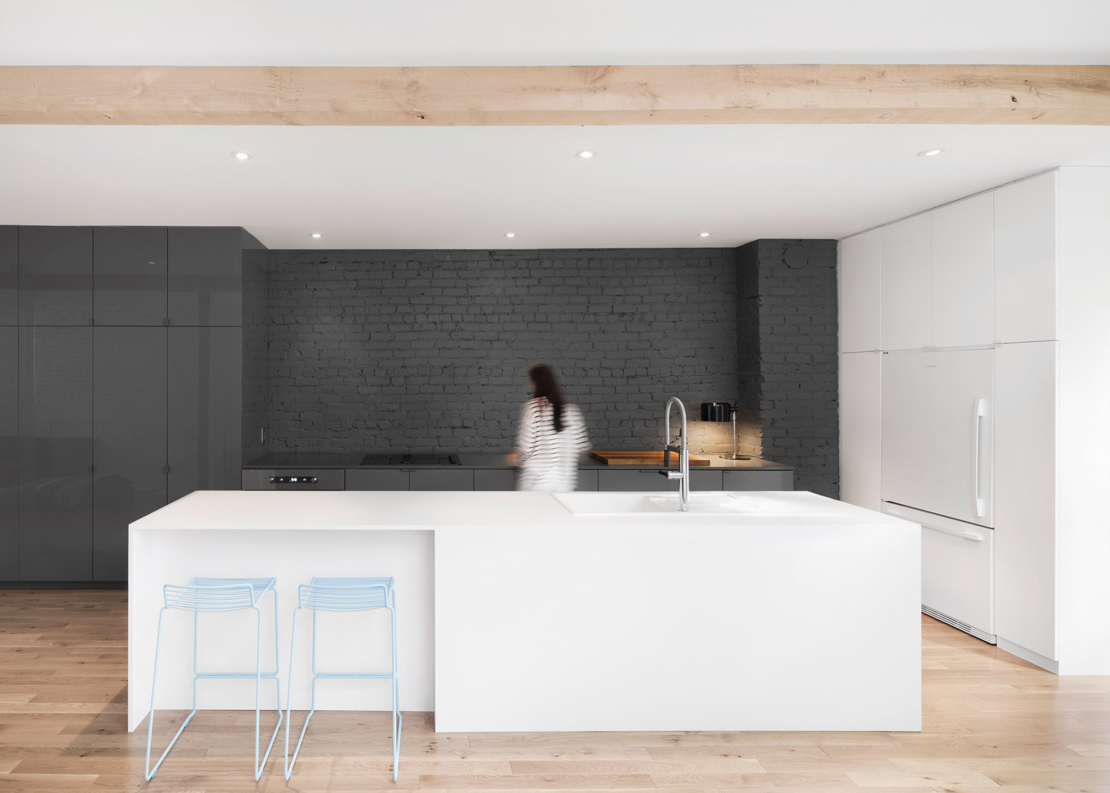 კანადელმა დიზაინერმა ანა სოფი გონომ მონრეალში მდებარე ბინის შიგნით ყველანაირი დატვირთვის კედელი მოხსნა და ისინი ხის კოჭებით შეცვალა, რამაც სახლი უზარმაზარ ღია გეგმად გადააქცია. სარემონტო სამუშაოების დროს აღმოჩენილი მასალებით, მათ შორის სამზარეულოში ნაპოვნი აგურის კედლით, ოთახებს შორის ვიზუალური საზღვრები იქმნება.