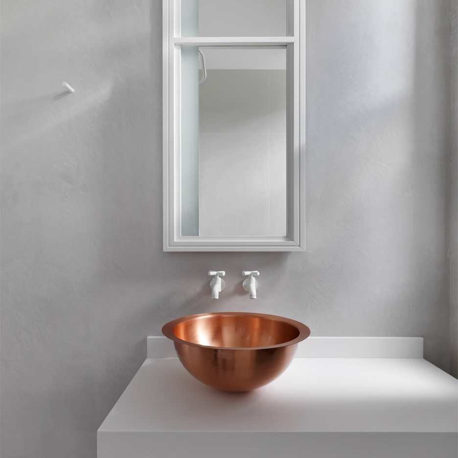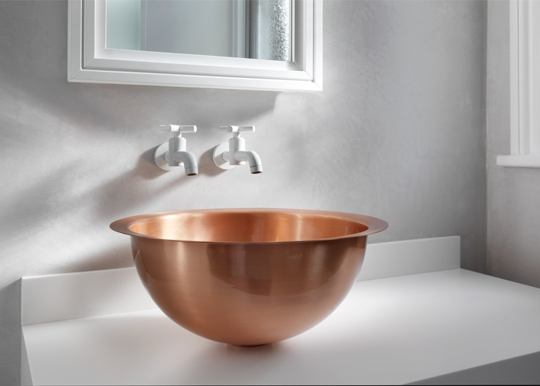 ლონდონში მდებარე სახლის დიზაინი მხოლოდ მასალის სპეციფიკითაა განსაზღვრული. სპილენძის ნიჟარა და თეთრი ონკანი ნათელი მაგალითია დიზაინერების ხედვისა, რომელიც არა უჩვეულო ფორმებითა და ფაქტურებით, არამედ მასალის თავისებურებით ქმნიან საინტერესო ინტერიერს.