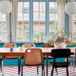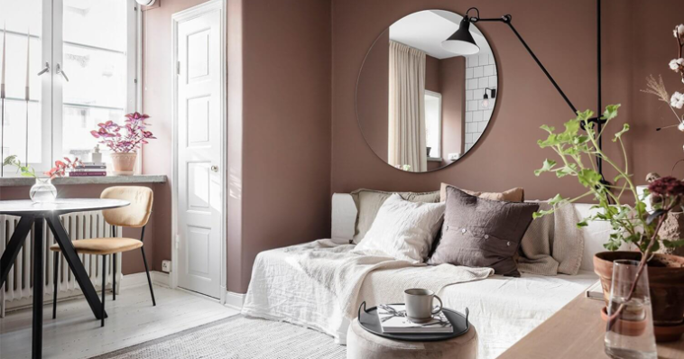 ინტერიერში გამოყენებულია ულამაზესი ვარდისფერი საღებავი კედლებისთვის, რომელიც იდეალურად ეხამება ბინის თეთრ იატაკსა და ნაცრისფერ და ქვიშისფერ დეკორს. აქვეა მდოგვისფერი სკამებიც, რაც საკმაოდ სასიამოვნო კონტრასტს ქმნის საერთო ფონთან მიმართებაში.