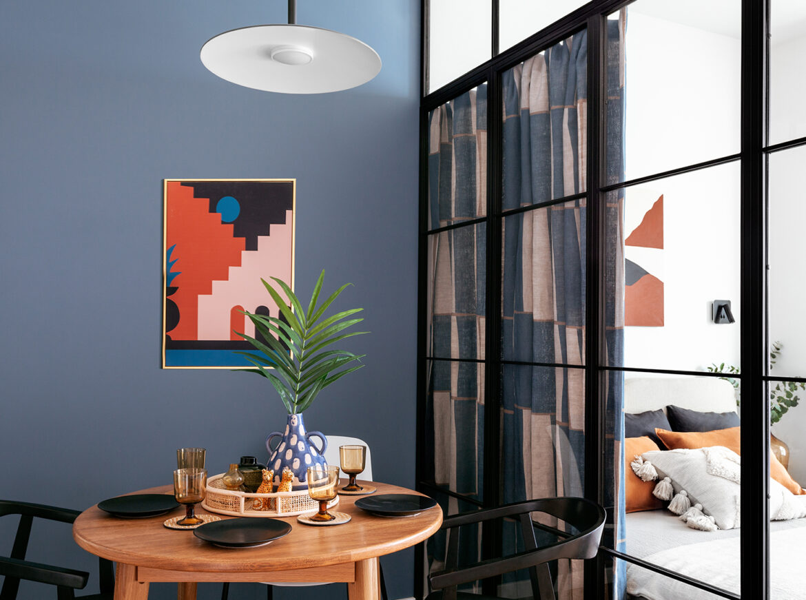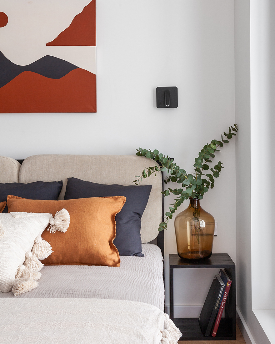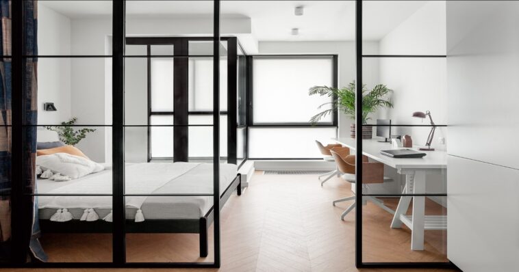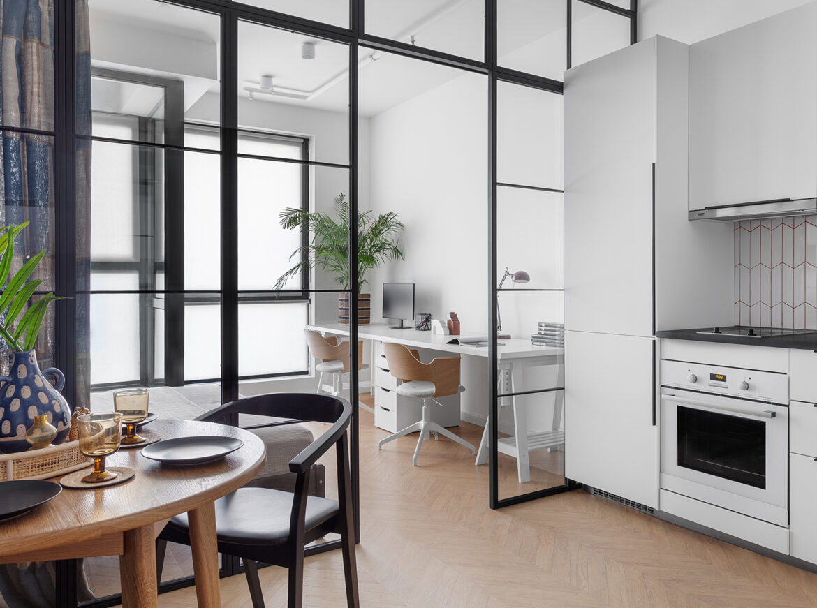 პატარა ბინაში დიზაინერებმა ფუნქციური და მოხერხებული გეგმარება შექმნეს. ერთ მხარეს საძინებელი და სამუშაო ადგილი განათავსეს. მეორე მხარეს კი სამზარეულო და სტუმრების მიღების სრულფასოვანი ზონაა ორგანიზებული. სივრცე შუშის მოძრავი ტიხრითაა ზონირებული. აუცილებლობის შემთხვევაში, ფარდების საშუალებით, პრივატული ბლოკის უცხო თვალისგან სავსებით დაფარვაა შესაძლებელი. ფერი, რომელიც ასევე ვიზუალურად ყოფს ფუნქციურ ზონებს, სივრცეს დინამიურობას მატებს.