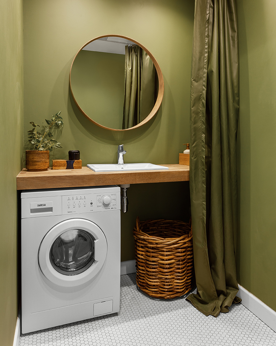 შემოსასვლელთან განთავსებული სველი წერტილები საინტერესოდაა გადაწყვეტილი. „ყოველ ჯერზე, როცა სტუმრები მოდიან, მათ საშხაპის პოვნა არ შეუძლიათ. ის, წყალგამძლე ფარდების გაშლის შემდეგ, საჭიროებისამებრ ჩნდება. ამოქმედებულ საშხაპეს ტექსტილი მოხდენილად ფარავს.