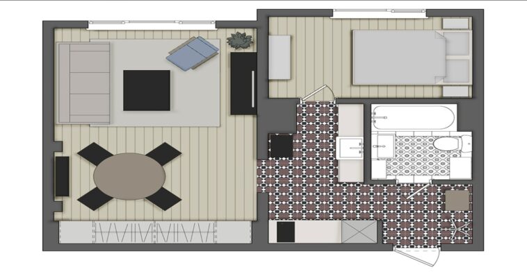 მათ დიზაინერთან ერთად შეისწავლეს არსებული ვარიანტები და ისეთი შეარჩიეს, რომელიც სამზარეულოსთვის, მისაღები ოთახისთვის და საძინებლისთვის ცალკე ზონების გამოყოფის საშუალებას მისცემდათ, ვინაიდან მათი მთავარი მოთხოვნა ორი სრულფასოვანი ოთახის შექმნა იყო სტანდარტულ “ერთ ოთახიან” პროექტში.