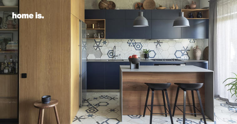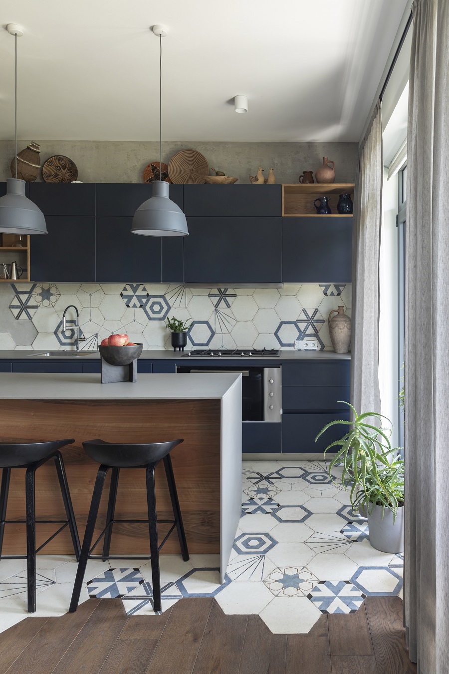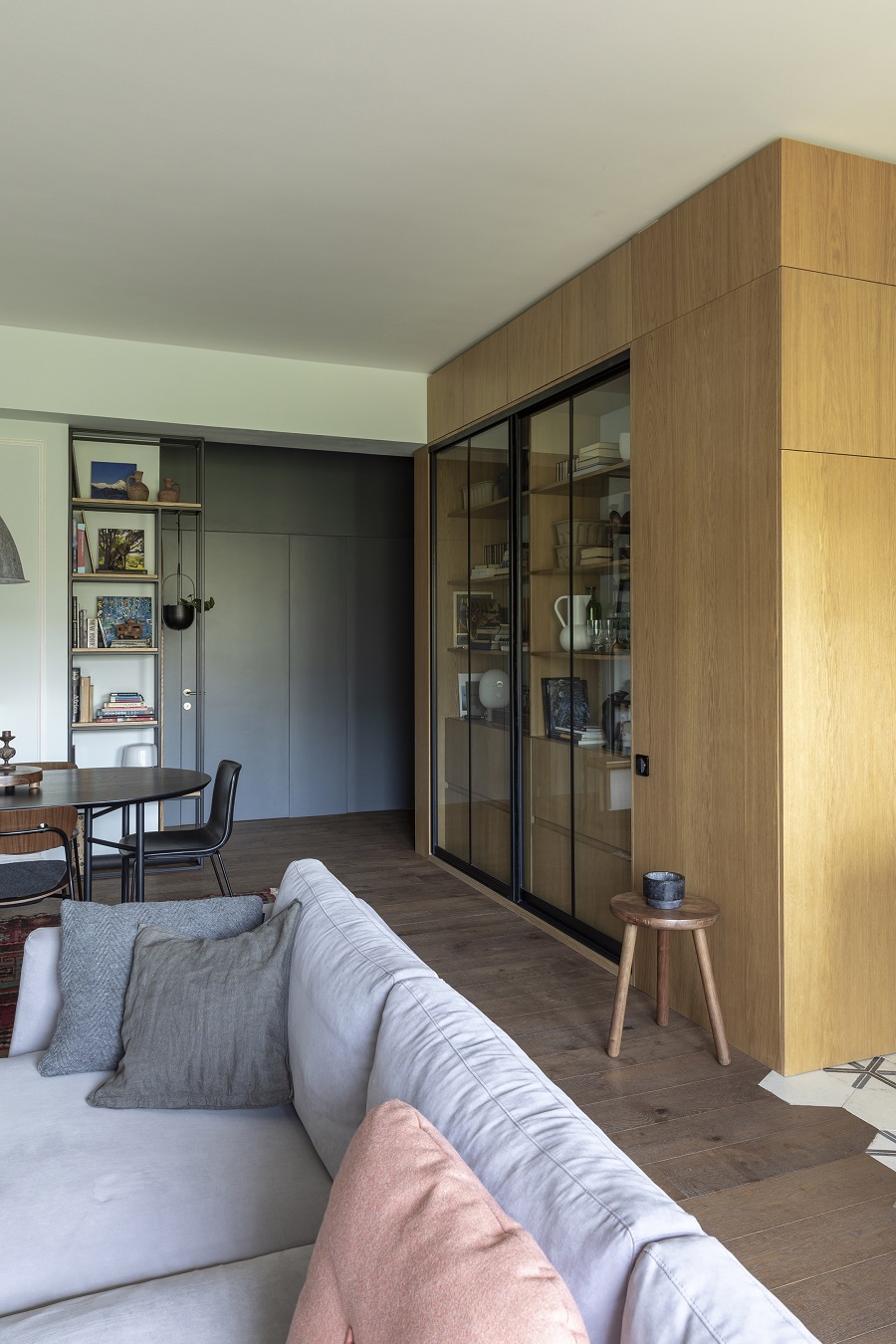 იატაკზე გამოყენებულია მუხის მუქი პარკეტი. ლურჯი სამზარეულოს საპირწონედ, მისაღებ ოთახში ღია ცისფერი კედლები შეირჩა, მათ შორის დამაკავშირებელი კარადის ტექსტურად კი ბუნებრივი მუხა. დივანი ნაცრისფერია, რომელსაც გარშემო აქცენტებად აქვს სხვადასხვა ზომისა და ტექსტურის მაგიდები.