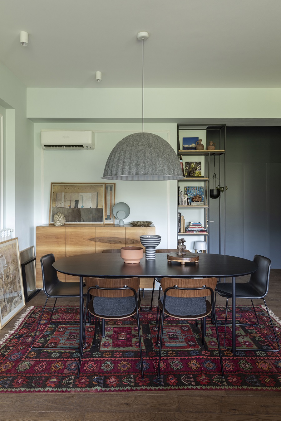 საერთო სივრცის სახასიათო დეტალია შავი სასადილო მაგიდა მუქი ფერის სკამებით.