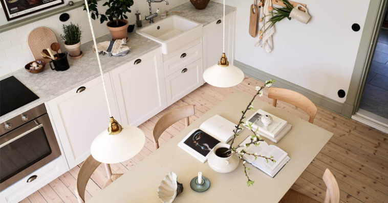 სახლის “გულს” სამზარეულო წარმოადგენს. აქ ულამაზესი ხის იატაკი და დიდი სასადილო მაგიდა გვხვდება. სამზარეულოს თეთრი ფერი დაბალანსებულია მარმარილოს ზედაპირითა და ღია მწვანე თაროებით. საკმაოდ საინტერესოა, რომ ბინაში კიბის უჯრედის სივრცეც ბოლომდეა ათვისებული და აქ მაცივარი, საყინულე და სამზარეულოს კარადებია ჩამონტაჟებული.