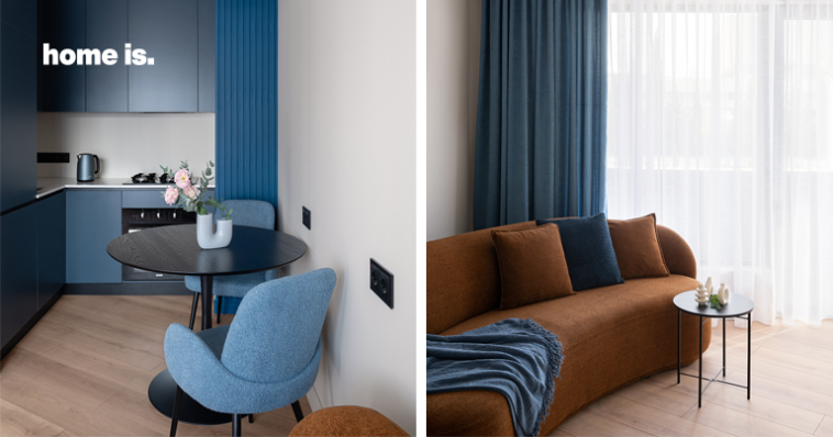 მისაღებ ოთახში ყურადღებას მოყავისფრო, ტერაკოტისფერი ტახტი იქცევს, რომელიც მომრგვალებული ფორმებით ხასიათდება და იდეალურად ერწყმის ბინის დიზაინს. წამყვან ლურჯ აქცენტებს პანელებსა და ფარდებზე, ღია ფერის კედლები აბალანსებს. ღია ხისფერი იატაკის საფარი კი მყუდრო და თბილ ატმოსფეროს უზრუნველყოფს.