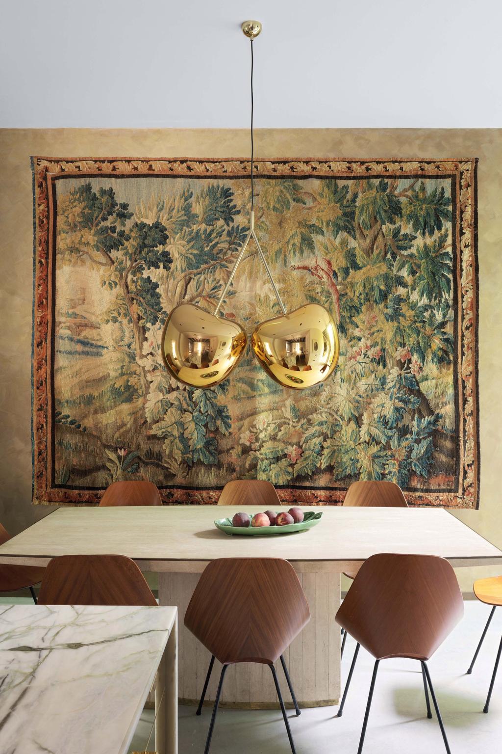 ტრავერტინის მაგიდა – Willy Rizzo, სკამები – Vittorio Nobili, სანათი – Qeeboo
