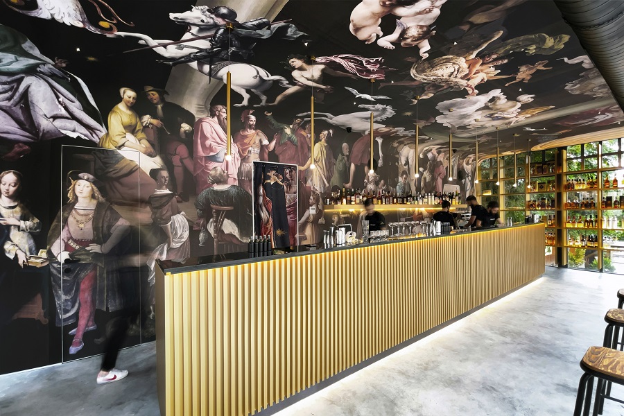 „ალკო ჰოლის“ ინტერიერის მთავარ ელემენტს წარმოადგენს სპეციალურად ამ ობიექტისთვის შექმნილი უზარმაზარი კედლის პანო, რომელსაც ერთიანი კოლაჟის სახე აქვს და შედგენილია რენესანსის ეპოქის მნიშვნელოვანი ფერწერული ტილოებისა და ფრესკების დეტალებისგან. კედლის ქაღალდის დიზაინზე Dadiani Architects-მა კომპანია „კრაკენის“ გრაფიკულ დიზაინერებთან – თინა მაყაშვილთან და ციცი ბოდოკიასთან ერთად იმუშავა.