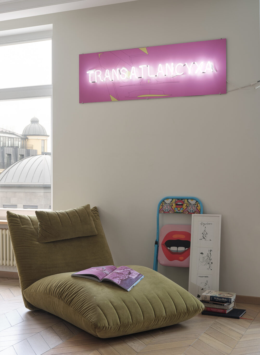 „კოსმოსური“ სამზარეულოდან მოგზაურობა, სადაც კვერცხის ფორმის სადა კუნძული დომინირებს (კვერცხი – სიცოცხლის სიმბოლო), მოსაცდელ ზონაში გრძელდება. აქ ანტონინა ბაევერის ნამუშევარი „Transatlancyxa“ მას „დედამიწისკენ“( სამზარეულოში) მიუძღვება, სადაც მომწვანო ბალიშებიანი დივანი, ყავისფერი გობელენი და ანასტასია პატიომკინას ჩონჩხის ნამუშევარი წუთისოფლის წარმავალობას დელიკატურად შეგვახსენებს.