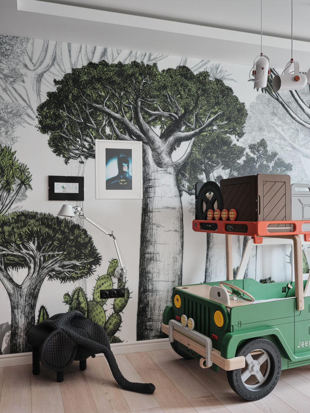 4 წლის ვაჟის ოთახის შპალერზე გამოსახული ფანტასტიკური ტყე ბავშვის მოზღვავებულ ენერგიაზე დამამშვიდებლად ზემოქმედებს.