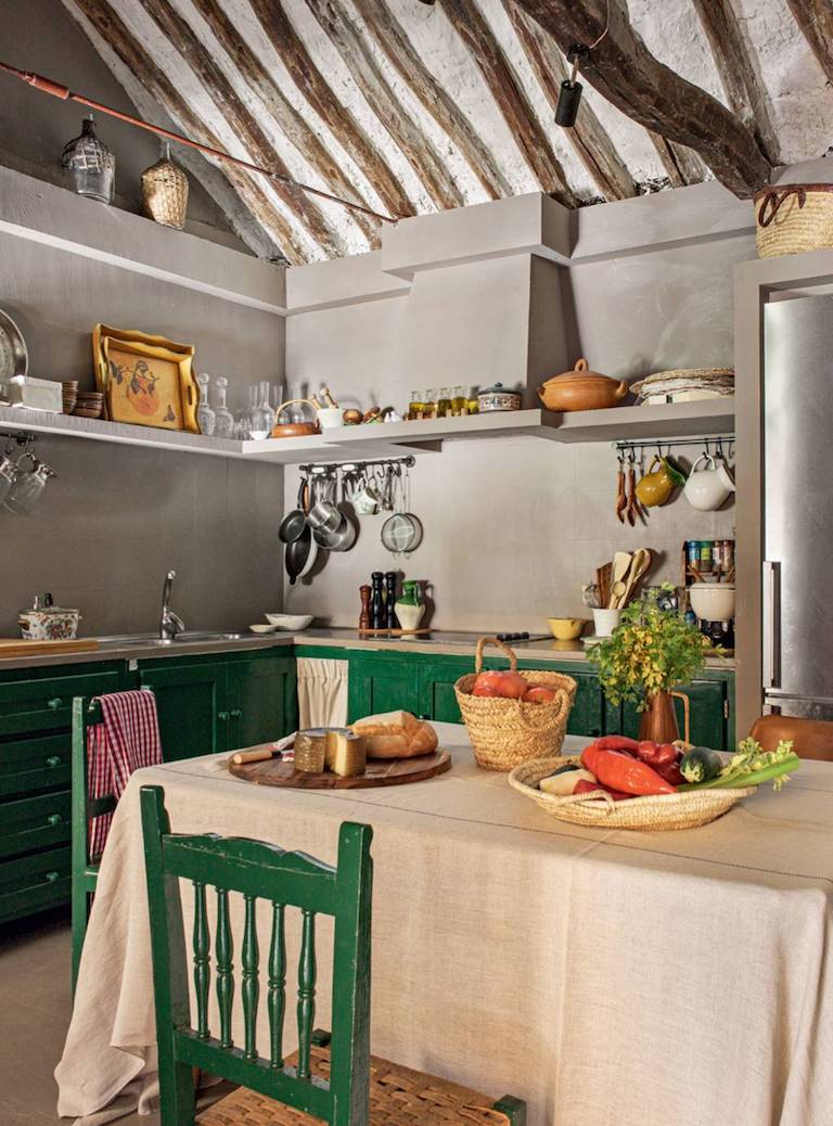 სამზარეულოში ღია თაროები, მწვანე ფერის სკამები და სამზარეულოს კარადები ნამდვილად ქმნიან სოფლის განწყობას.