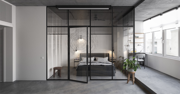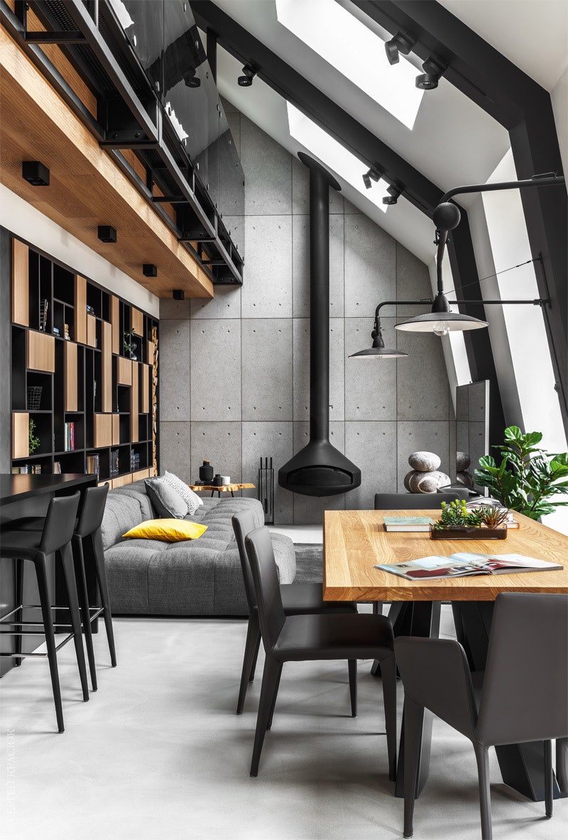 “INT2“ სტუდიის მიერ შესრულებულ ამ ბინაში კი ბეტონი მასალებისა და რემონტის ხარჯების დაზოგვის მიზნით გამოიყენეს. მოჭიმული იატაკი უდიერად განზრახ არის დამუშავებული და ბეტონის დამცავი საღებავით დაფარული. ჭერი აქ დამუშავების გარეშეა შეღებილი. ამ გზით სტუდიამ ინდუსტრიული სტილის ადვილად განახლებადი სივრცე შექმნა. ასეთი „მოუწესრიგებელი“ ზედაპირები ისტორიულ სახლებში უზადოდ დამუშავებულ კედლებთან შედარებით უფრო ბუნებრივად აღიქმება.