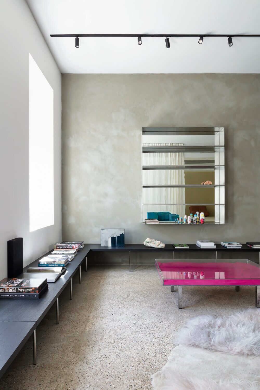 ბეტონის იატაკები შესაძლებელია ელვარებამდე გაპრიალდეს, ან პირიქით, მასზე ბეტონის ფაქტურა შენარჩუნდეს და დამცავი ხსნარით დაიფაროს. ამ პროექტში ოთახებს ტაქტილური იატაკი აერთიანებს, რომელსაც „უდიერად“ შეღებილი კედლები ჰარმონიულად ერწყმის. დიზაინერებმა ისინი ცემენტის საღებავით დაფარეს. მოუხეშო ზედაპირებისგან და ლაკონიური ფორმებისგან მიღებულ შთაბეჭდილებას რბილი ნოხები, ტყავის ვინტაჟური სავარძლები და „კუშეტები“, ხავერდის დივანი და კომპაქტური მცენარეები ავსებს.