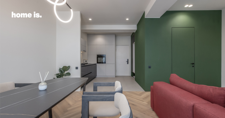 მისაღები ოთახი მუქ და კონტრასტულ ფერებშია გაწყობილი. მწვანე ფერის კედლები ოთახის მცენარესთანაა ჰარმონიაში, ხოლო ჭერს თეთრი განათების მქონე ჭაღი ამშვენებს, რომელიც, ბინის მფლობელის სურვილისამებრ, ოთახს იტალიურ ხასიათს ანიჭებს. მწვანე კონტრასტული ფერი, რომელიც გამოყენებულია მისაღებში, ისე საძინებელში, დაბალანსებულია სხვა კედლების ღია რძისფერით. ღვინისფერი წითელი დივანი კი დაბალანსებულია ხისფერ იატაკთან და ტელევიზორის მუქ ტონთან.