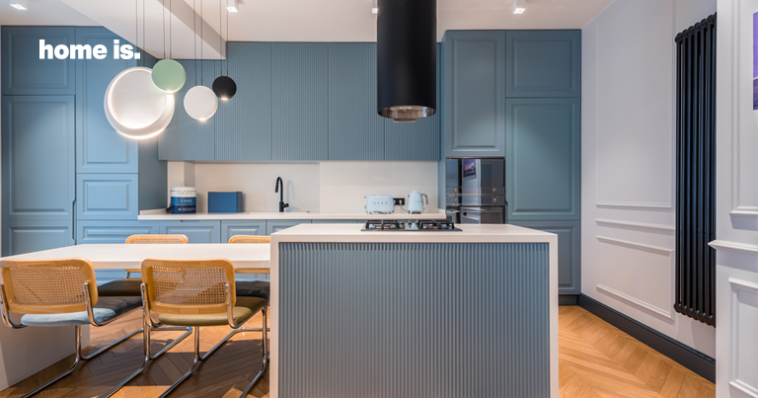 ყურადღებას იქცევს ორიგინალური ფორმებით გამორჩეული სანათების დიზაინიც, რომელიც, ჭერში უხვად დამონტაჟებულ განათებასთან ერთად, ნათელ, ელეგანტურ ატმოსფეროს ქმნის. სამზარეულოს თითოეული დეტალი ინტერიერის კონცეფციას ესადაგება და ვიზუალს დასრულებულ, სრულყოფილ იერს სძენს. მაგალითად, ლურჯი პლინტუსები და მუქი ლურჯი რადიატორი ამ ნაწილის მდიდრულ, დახვეწილ დიზაინს უსვამს ხაზს.