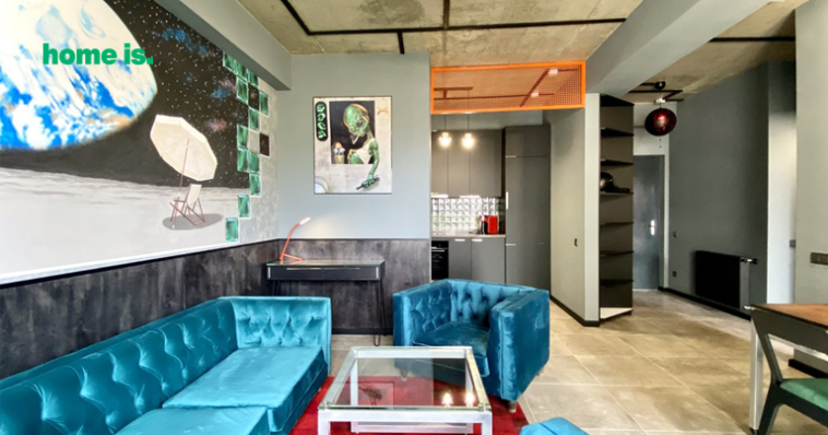 ბინის მფლობელისა და დიზაინერის ერთობლივი გადაწყვეტილებით, დიზაინის თემად კოსმოსი და კოსმოსური მოგზაურობა შეირჩა. ინტერიერში მუქი ფერების დომინირების მიუხედავად, მისი იერსახე პირქუში და ბრუტალური არაა, რაც მეტწილად კედლის მხატვრობის დამსახურებაა. აღნიშნული ნამუშევრები თავად დიზაინერს, იკო ცაბაძეს ეკუთვნის და მეპატრონის თვალსაზრისით, სახლში ყველაზე მნიშვნელოვან ელემენტს წარმოადგენს.