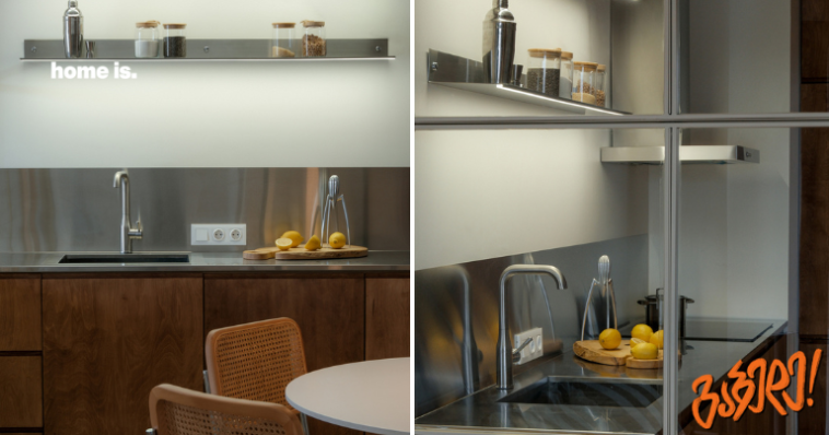 ძირითადი აქცენტი გაკეთებულია მასალების კონტრასტზე. უჟანგავი მეტალის სიზუსტე და “სიცივე” ფანერის ბუნებრივ სითბოს ერწყმის ისე, რომ წარმოიქმნება ჰარმონიული ბალანსი მკაფიო ფორმებსა და ნატურალურ ტექსტურებს შორის. ეს ერთგვარი დიალოგია ინდუსტრიულ სტილსა და ბუნებრივ სიმშვიდეს შორის, რაც სივრცეს აძლევს დამახასიათებელ ენერგიას.