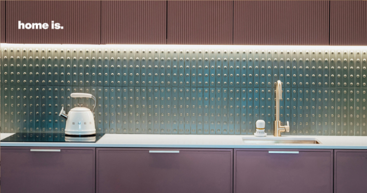 სამზარეულო ერთ-ერთი დომინანტი სივრცეა ბინაში — ბურგუნდისფერი და თეთრი ტონები აქ ერთმანეთს აბალანსებს, ხოლო წინსაფრის სახით გამოყენებული „MUTINA“-ს ფაქტურული ფილები ტექსტურასა და ხასიათს მატებს სივრცეს.