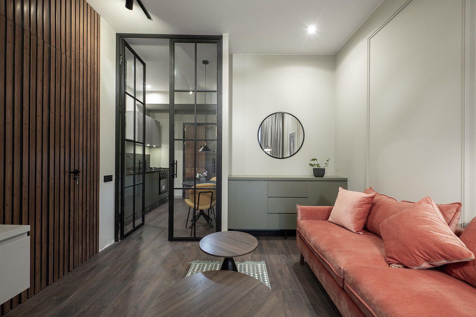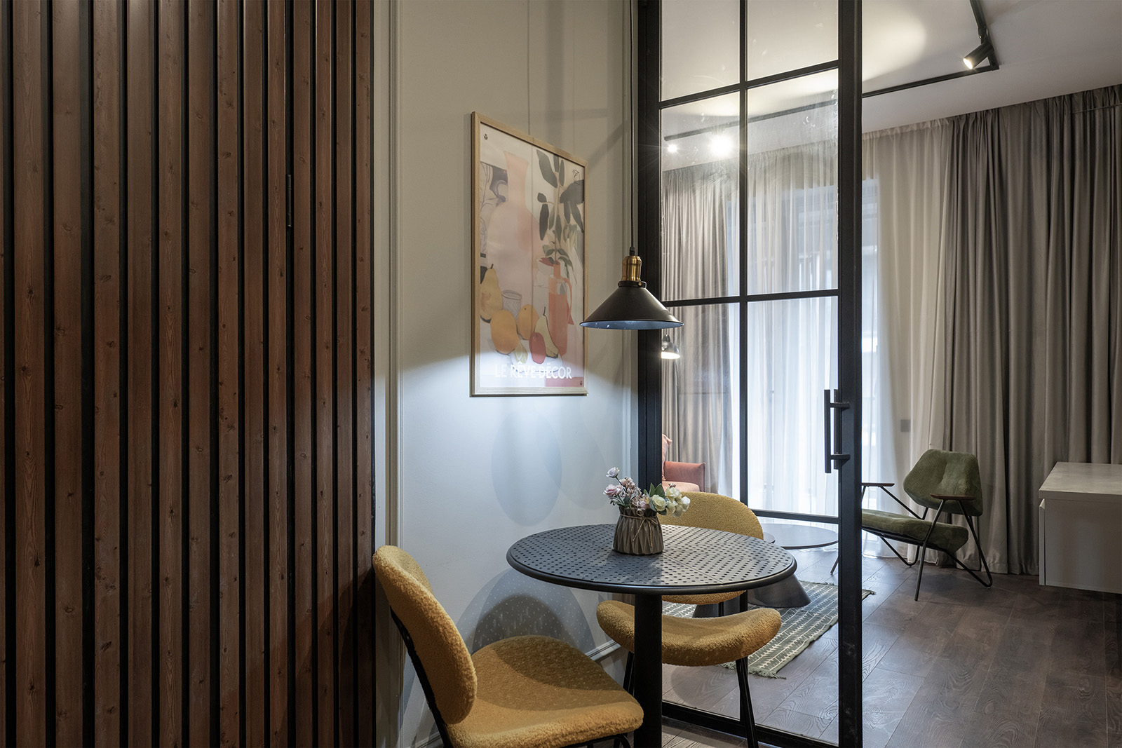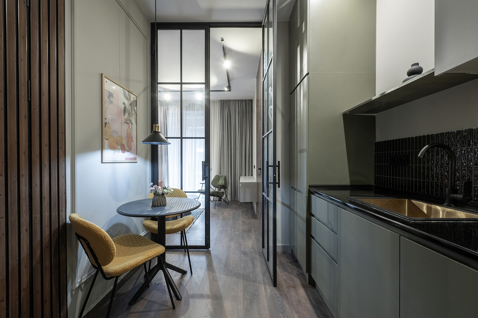 საერთო ფართობი მხოლოდ 44 კვ.მ-ს შეადგენს, თუმცა მცირე ზომის მიუხედავად, ბინას არ აკლია ფუნქციონალური ზონების სრულყოფილად მოწყობა. ერთ-ერთი ყველაზე მნიშვნელოვანი გადაწყვეტა სწორედ სამზარეულოსა და მისაღების დელიკატურად გაყოფა იყო — რაც დამატებით სიმყუდროვეს ანიჭებს მოსასვენებელ ზონას და ქმნის შეგრძნებას, თითქოს სივრცე გაცილებით უფრო ვრცელია, ვიდრე ეს რეალურადაა. ეს გადაწყვეტა მეტად იშვიათია ბინების ამ ტიპის გეგმარებაში და სწორედ ამიტომ ქმნის განსაკუთრებულ ეფექტს.