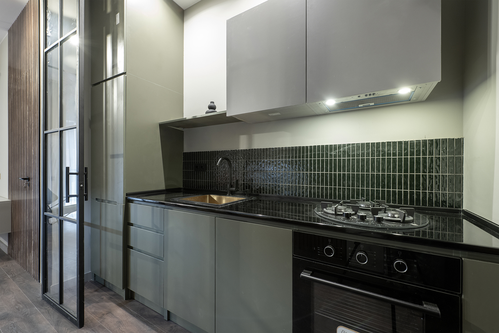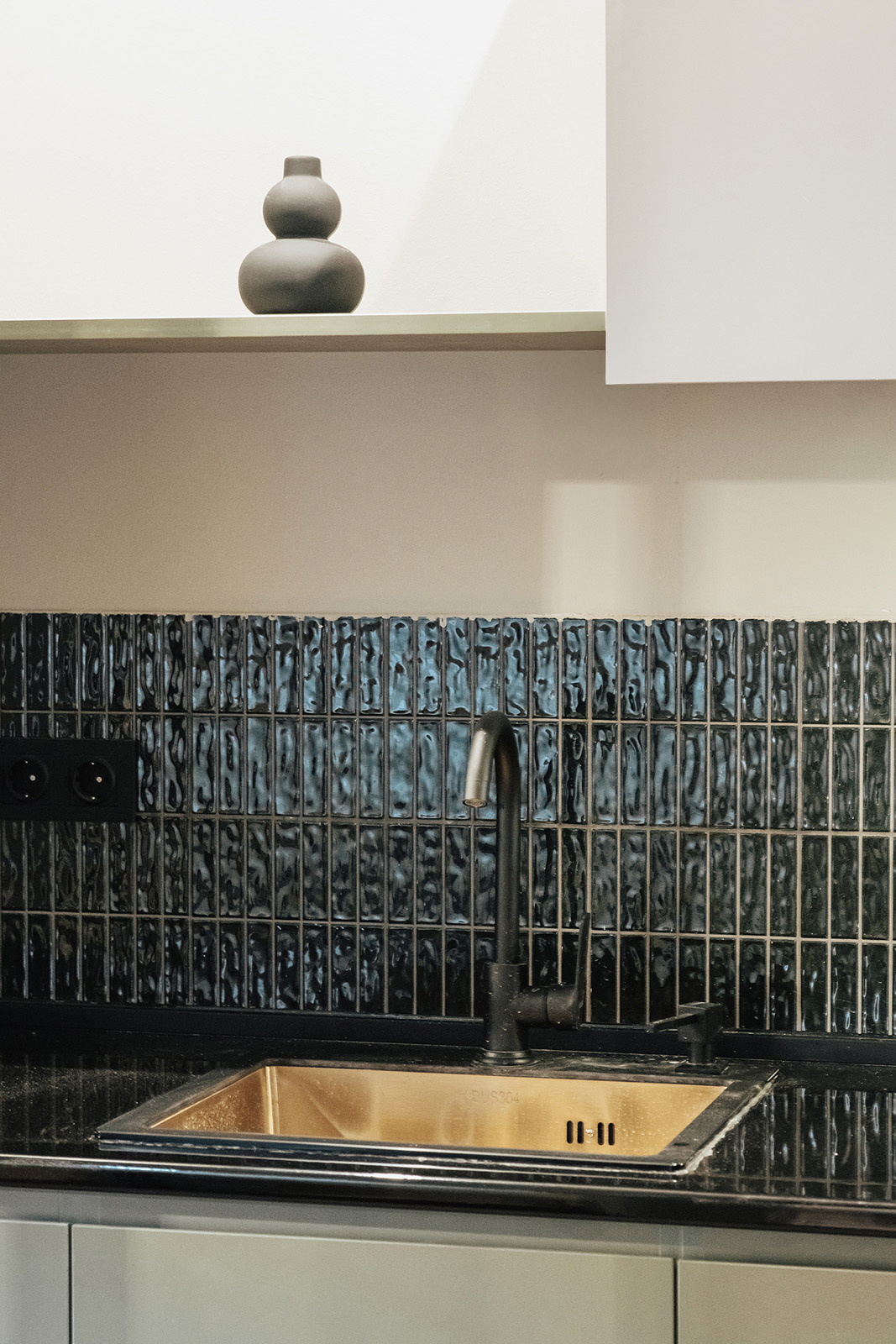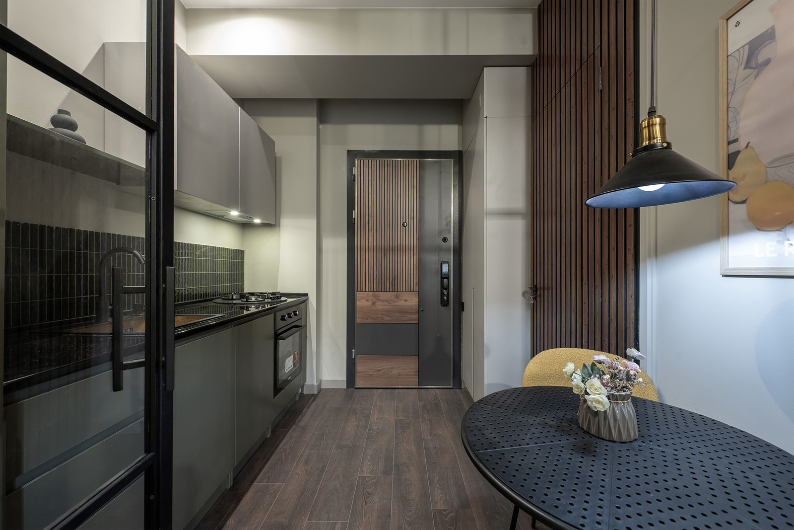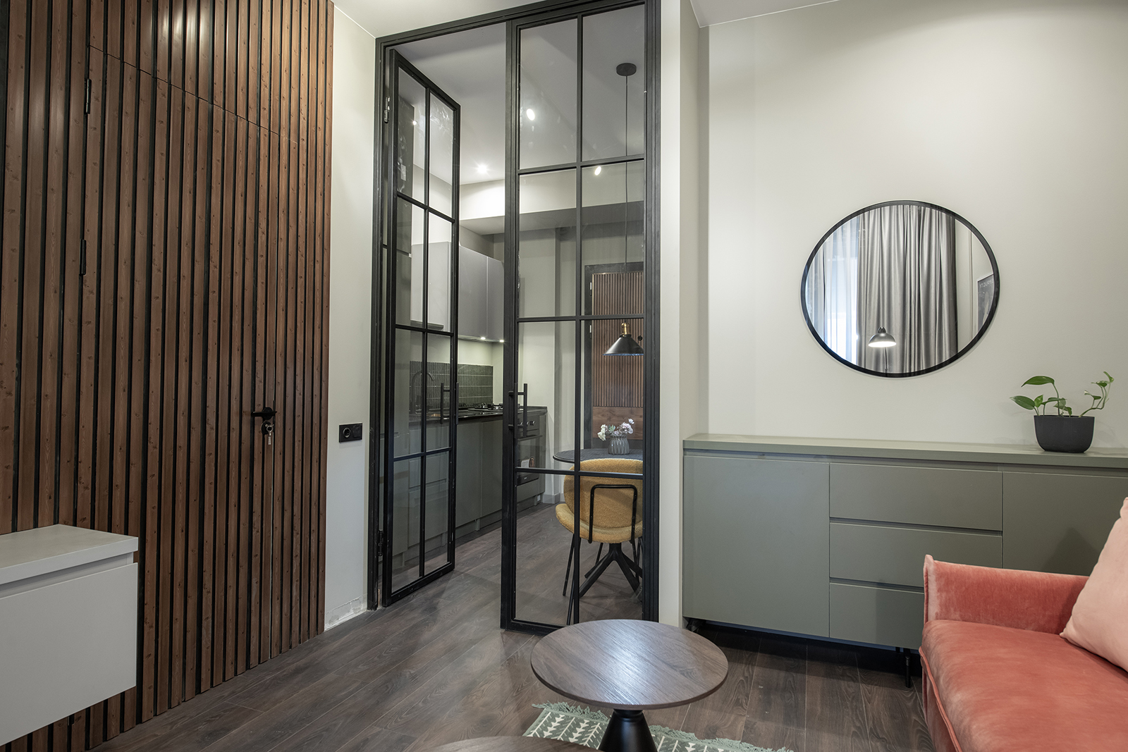 საერთო ფართობი მხოლოდ 44 კვ.მ-ს შეადგენს, თუმცა მცირე ზომის მიუხედავად, ბინას არ აკლია ფუნქციონალური ზონების სრულყოფილად მოწყობა. ერთ-ერთი ყველაზე მნიშვნელოვანი გადაწყვეტა სწორედ სამზარეულოსა და მისაღების დელიკატურად გაყოფა იყო — რაც დამატებით სიმყუდროვეს ანიჭებს მოსასვენებელ ზონას და ქმნის შეგრძნებას, თითქოს სივრცე გაცილებით უფრო ვრცელია, ვიდრე ეს რეალურადაა. ეს გადაწყვეტა მეტად იშვიათია ბინების ამ ტიპის გეგმარებაში და სწორედ ამიტომ ქმნის განსაკუთრებულ ეფექტს.