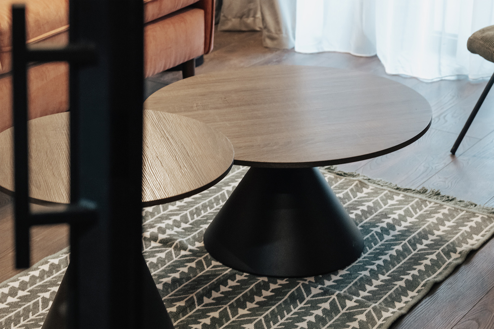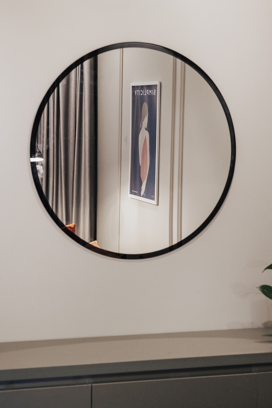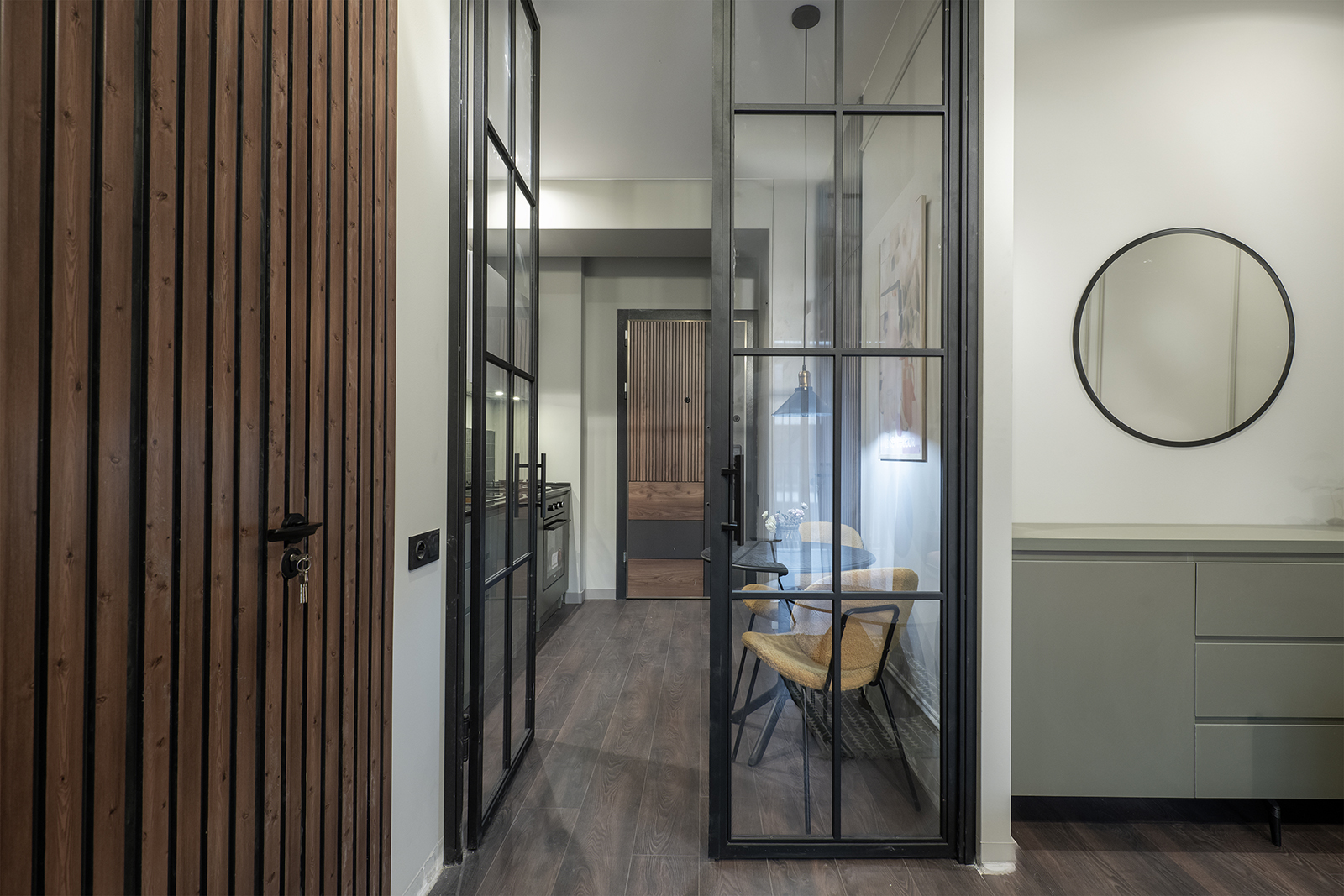 დიზაინში მნიშვნელოვანი როლი ხის პანელებს აქვს მინიჭებული — მათი დახმარებით მისაღების კედლის მონაკვეთი, რომელიც ფარულ კარს მალავს, გარდაიქმნა დეკორატიულ კომპოზიციად, რომელიც მთლიან ინტერიერს მატებს სიღრმესა და ტექსტურულ მრავალფეროვნებას. ფარული კარის დანერგვამ არა მხოლოდ ფუნქციური, არამედ ესთეტიკური ღირებულებაც მოიტანა — კედლის მთლიანობა არ ირღვევა და სივრცე კიდევ უფრო ლაკონური და „დალაგებული“ გამოიყურება.