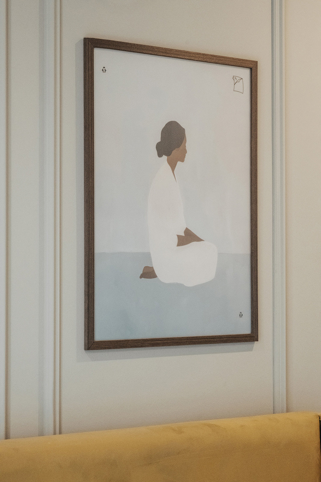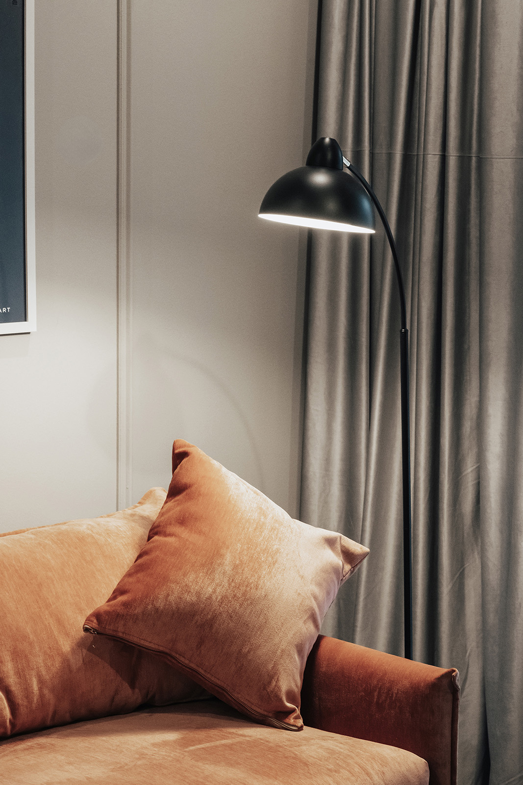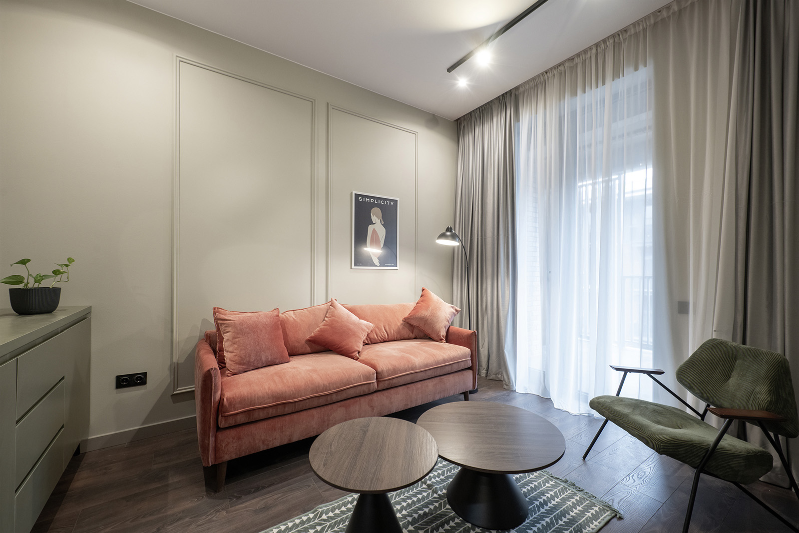 ამ ბინის მთავარი ემოციური აქცენტი მისაღებში მდებარე დივანია — რბილი, კომფორტული და ვიზუალურად ეფექტური. მტვრიან ვარდისფერში გადაწყვეტილი ავეჯის ეს ელემენტი კონტრასტშია ინტერიერის ღია ტონებთან და იმავე დროს მათ ავსებს. მისი შეფერილობა და სილუეტი მთელ ბინას გარკვეულ დრამატურგიას სძენს, რის გამოც იგი ხდება სივრცის შთამაგონებელი წერტილი.