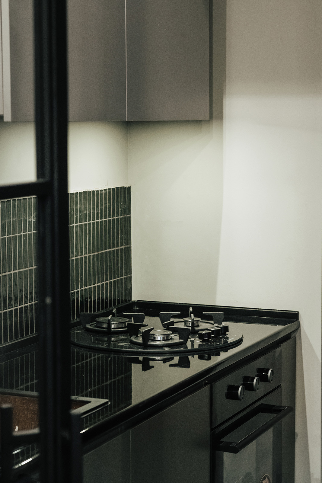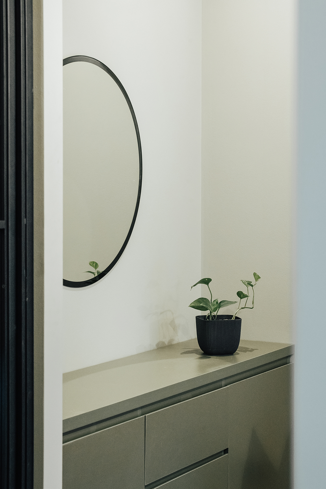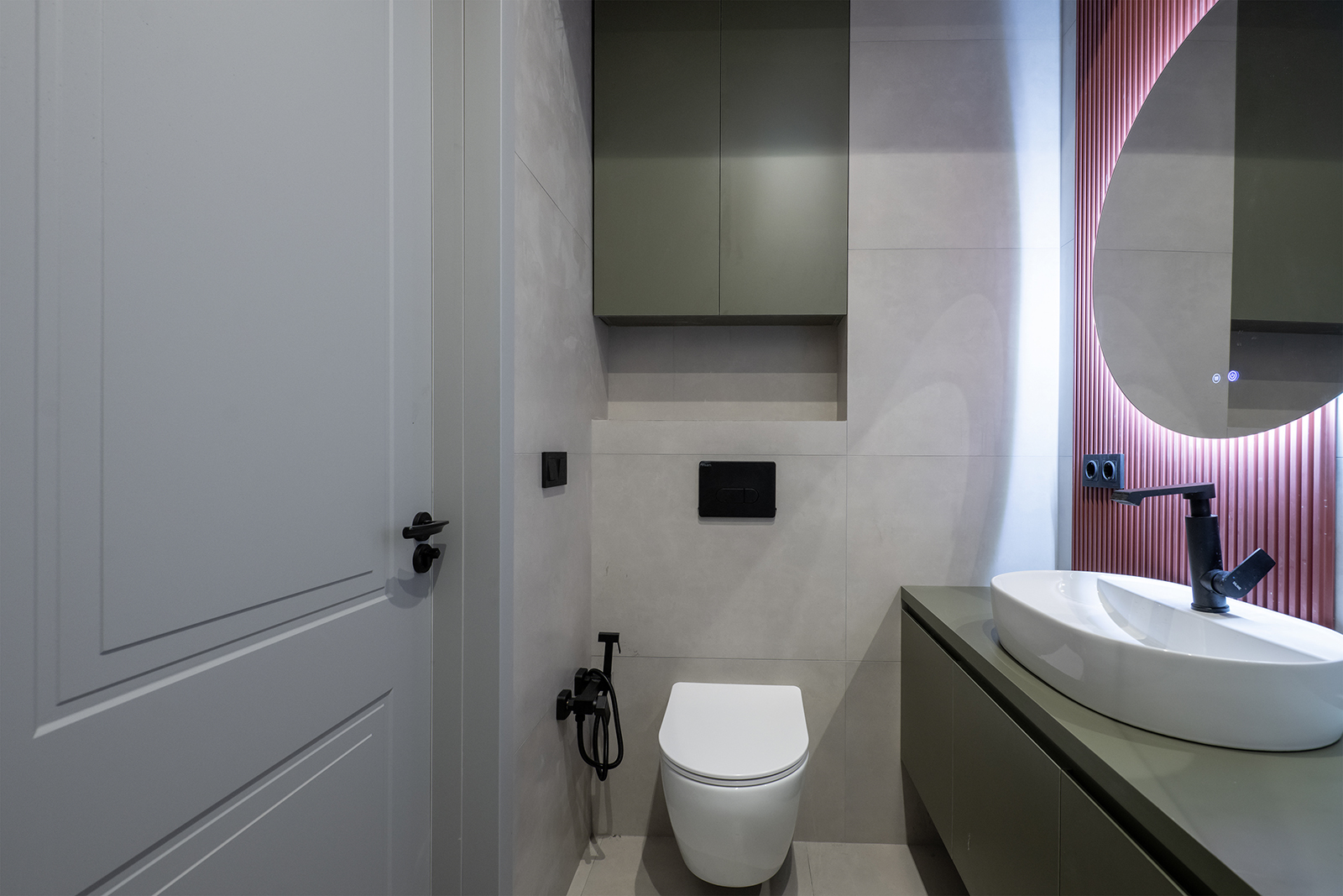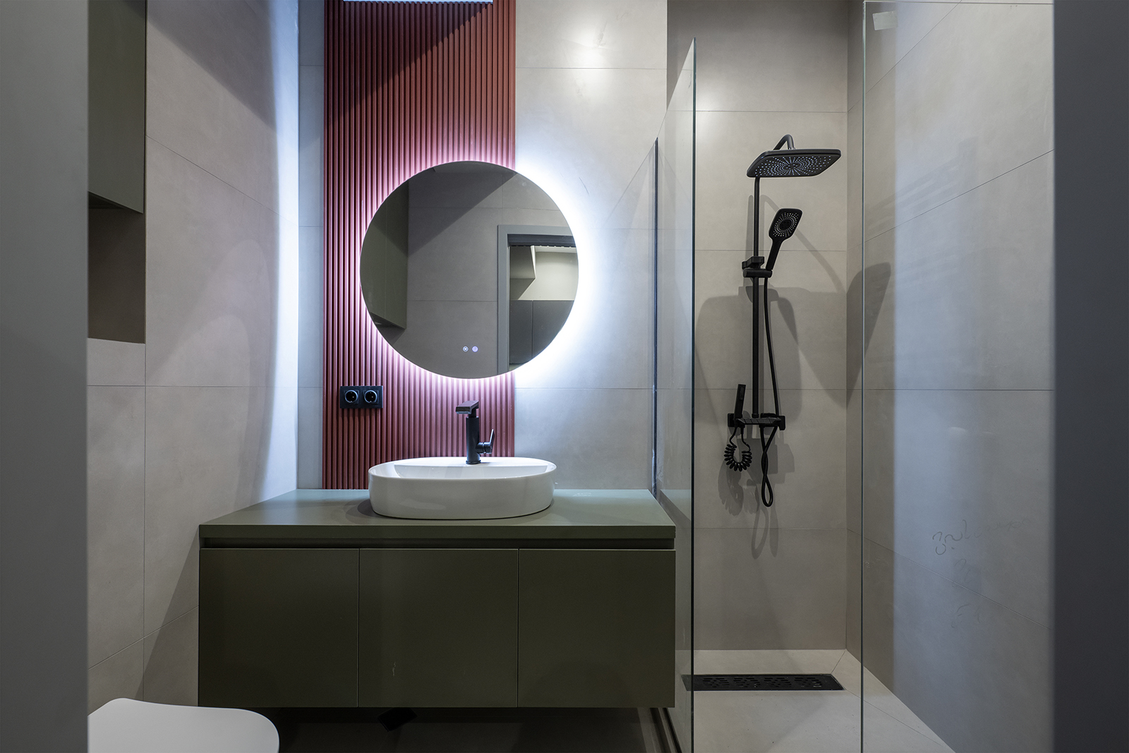 აბაზანაში საერთო კონცეფციის ფერთა გამას აგრძელებს დომინანტური მწვანე და შავი დეტალები — შხაპის სისტემა, ნიჟარის ონკანი და განათებული სარკე. აქ წითლად შეფერილი ვერტიკალური რელიეფის პანელი სარკის უკან განსაკუთრებულ სივრცით აქცენტს ქმნის.