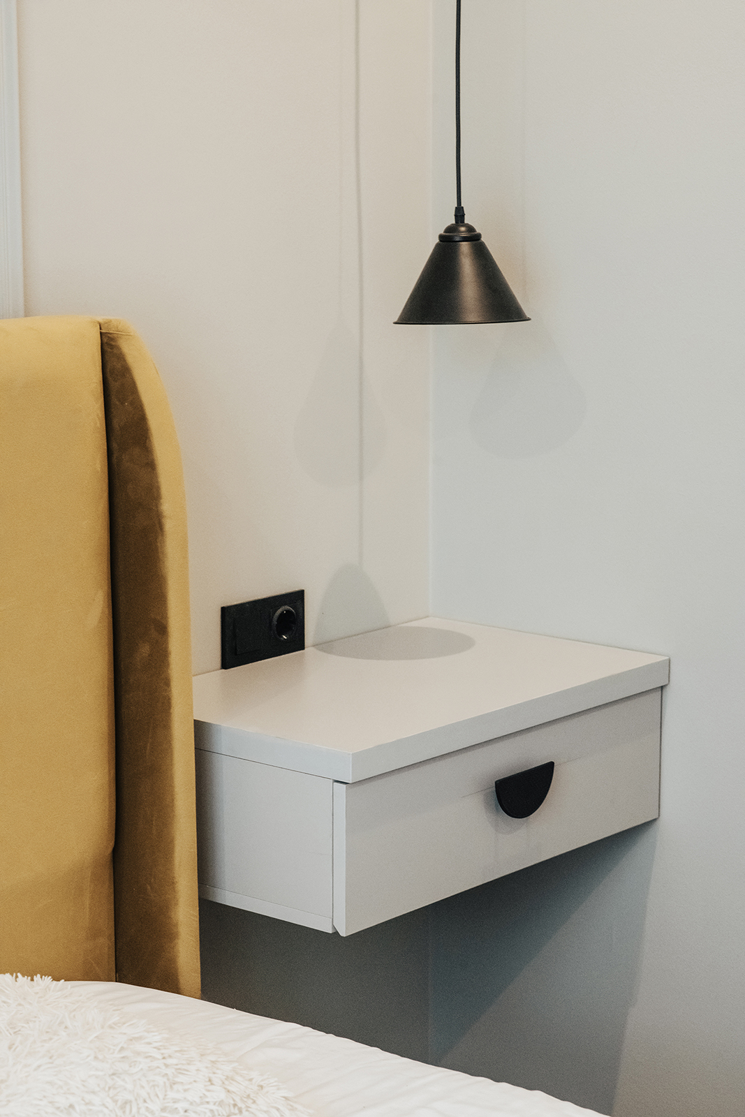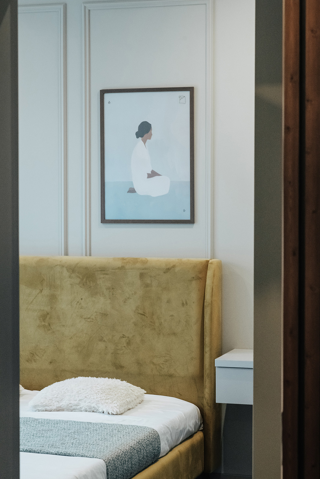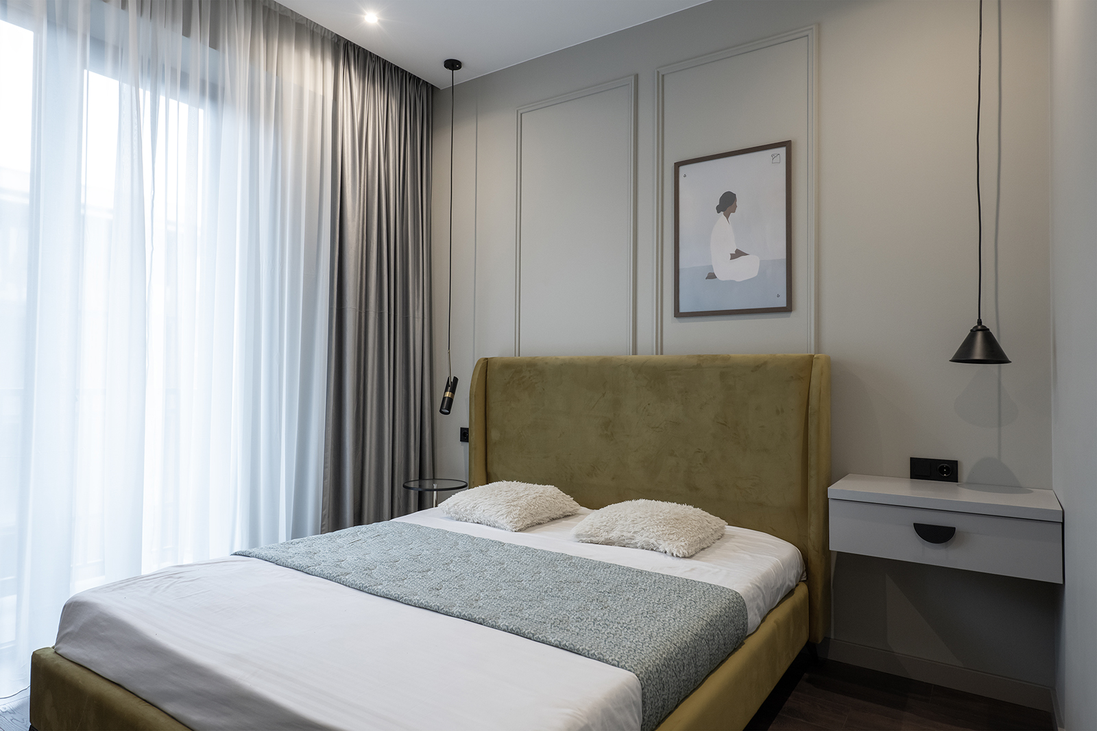 საძინებელში დიზაინის მთავარი ელემენტია მოყვითალო ტექსტილის მქონე საწოლი, რომელიც მინიმალისტურ, ფერწერულად ნეიტრალურ კედლებთან ერთობაში მოდის და სიმშვიდესთან ერთად, ელეგანტურ შთაბეჭდილებას ტოვებს.
