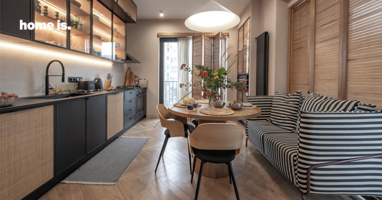 განსხვავებული და დახვეწილი დიზაინით გამოირჩევა სამზარეულო, სადაც საუცხოო ესთეტიკას ხის დარაბები ქმნის. ეს ელემენტი განსაკუთრებულ იერს სძენს ოთახს და ორგანულად ერწყმის ხის სამზარეულოს ავეჯს, იატაკის საფარს და პატარა სასადილო მაგიდას. შავი დეტალებით გამდიდრებულ სივრცეს დეკორატიული განათება უფრო ელეგანტურს ხდის. კონტრასტის სახით შემოტანილი შავ-თეთრი ტახტი კი ამავე ფერებში გადაწყვეტილ მცირე ზომის ხალიჩას ესადაგება. იქმნება შთაბეჭდილება, რომ თითოეული ელემენტი ერთმანეთთან კავშირს ამყარებს და საოცარ ჰარმონიას ქმნის.
