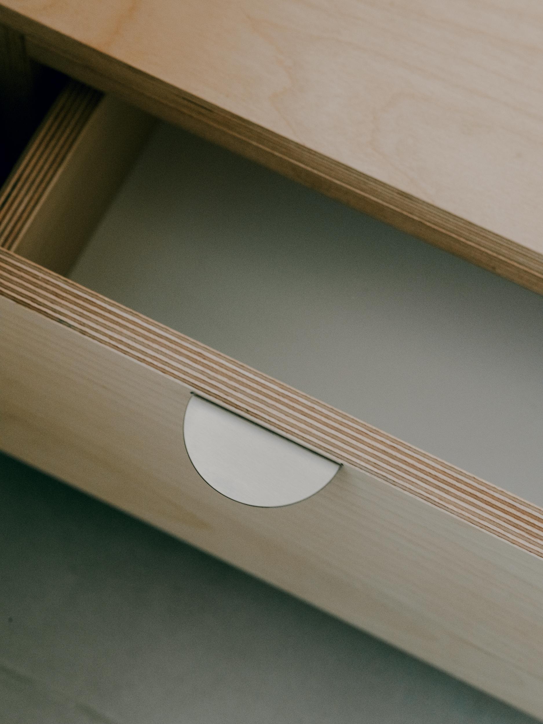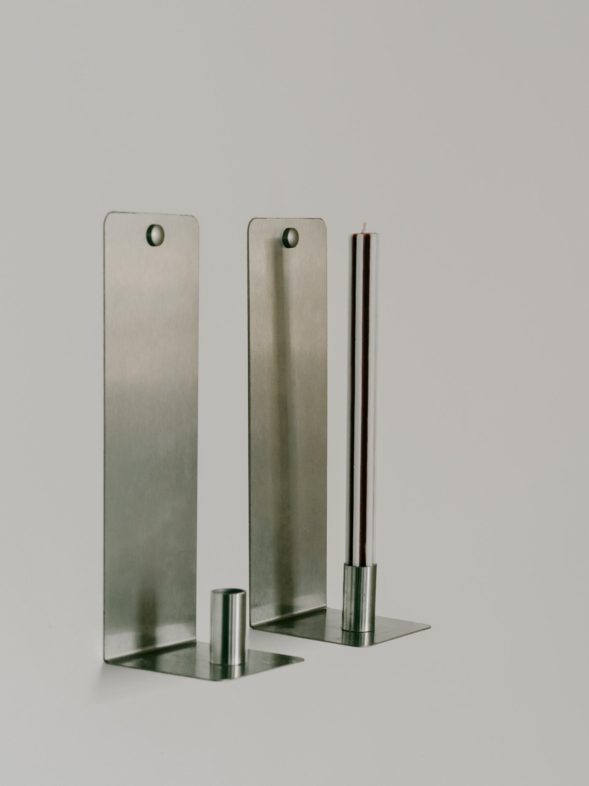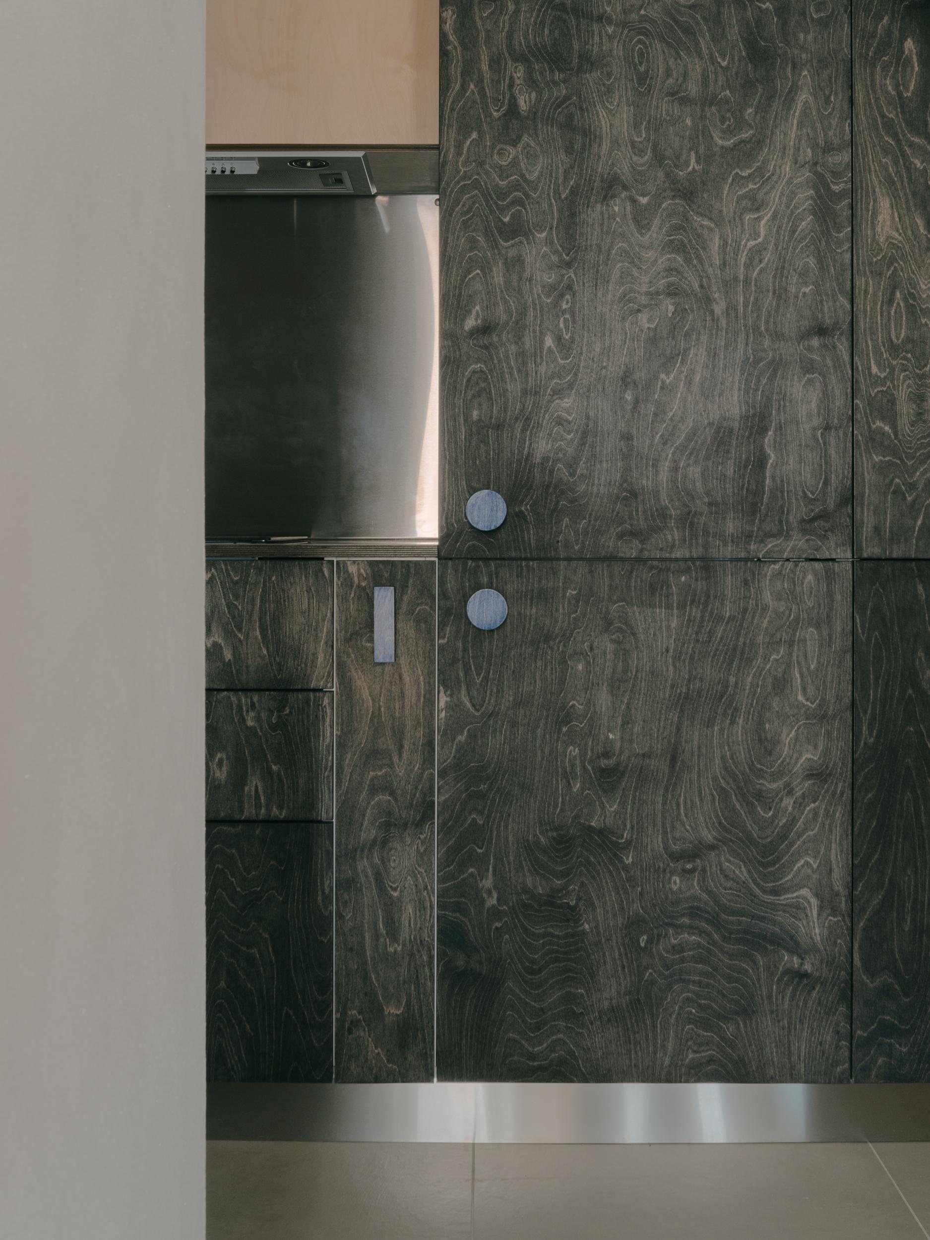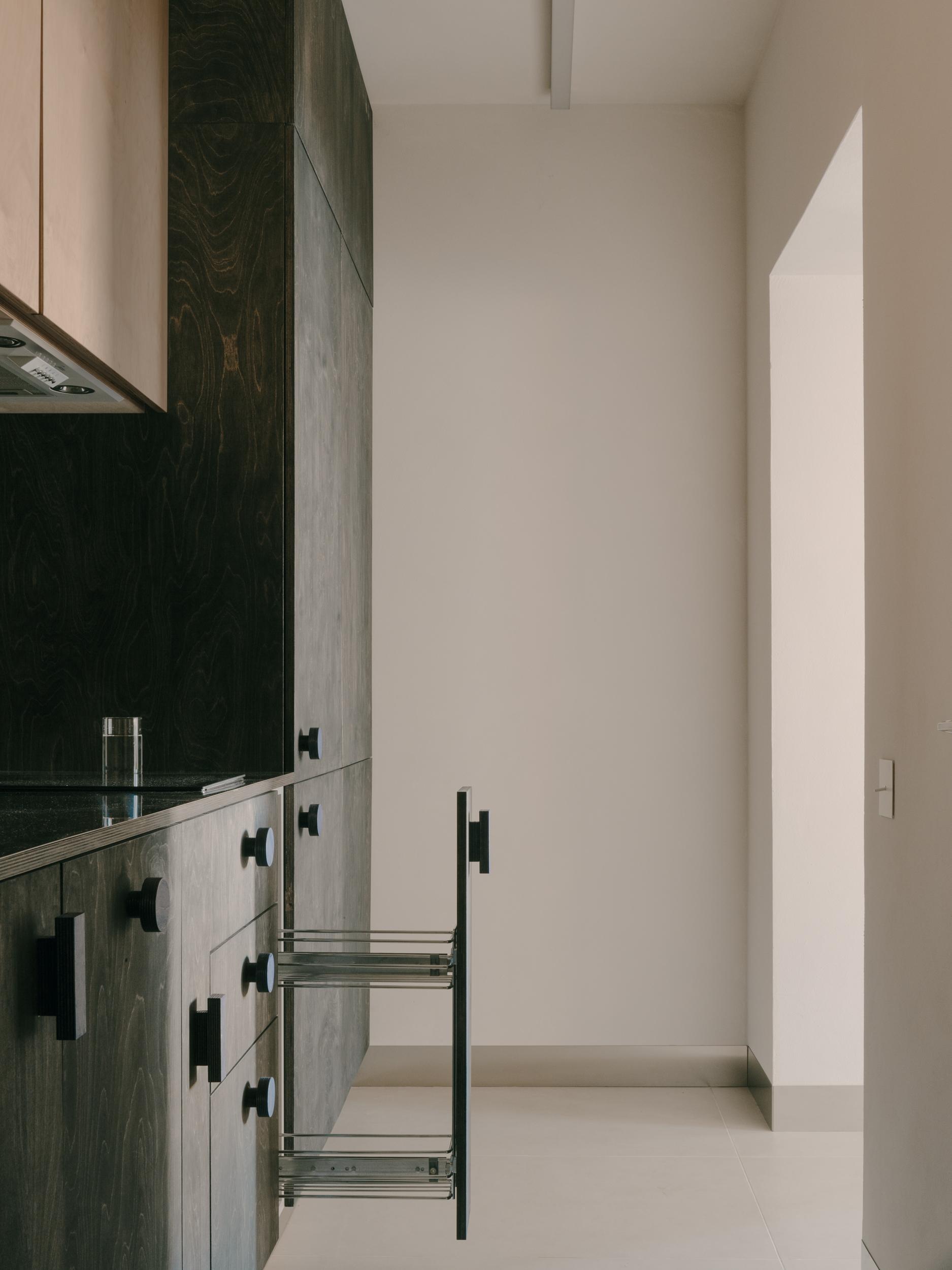 პროექტში გამოყენებული მასალები სტრატეგიულად არის შერჩეული სივრცის მასშტაბისა და გარემოს გათვალისწინებით. ფანერა გამოიყენება როგორც დიდ ზედაპირებზე, ისე მცირე აქცენტებში, რაც ინტერიერს სითბოსა და ბუნებრივობას მატებს. იგივე პრინციპი ვრცელდება უჟანგავ ფოლადზეც — ის ფარავს ძირითად ზედაპირებს აბაზანაში, სამზარეულოსა და საგარდერობო სივრცეში და პარალელურად ჩნდება დახვეწილ დეტალებში: საწოლის ტუმბოში, სახელურებში, სასანთლეებსა და თაროებში. ერთი და იგივე მასალის სხვადასხვა მასშტაბზე გამოყენება ცხადყოფს, თუ როგორ იცვლება მისი აღქმა ზომის ცვლილებასთან ერთად და როგორ გარდაიქმნება იგი სივრცის განუყოფელ ნაწილად.