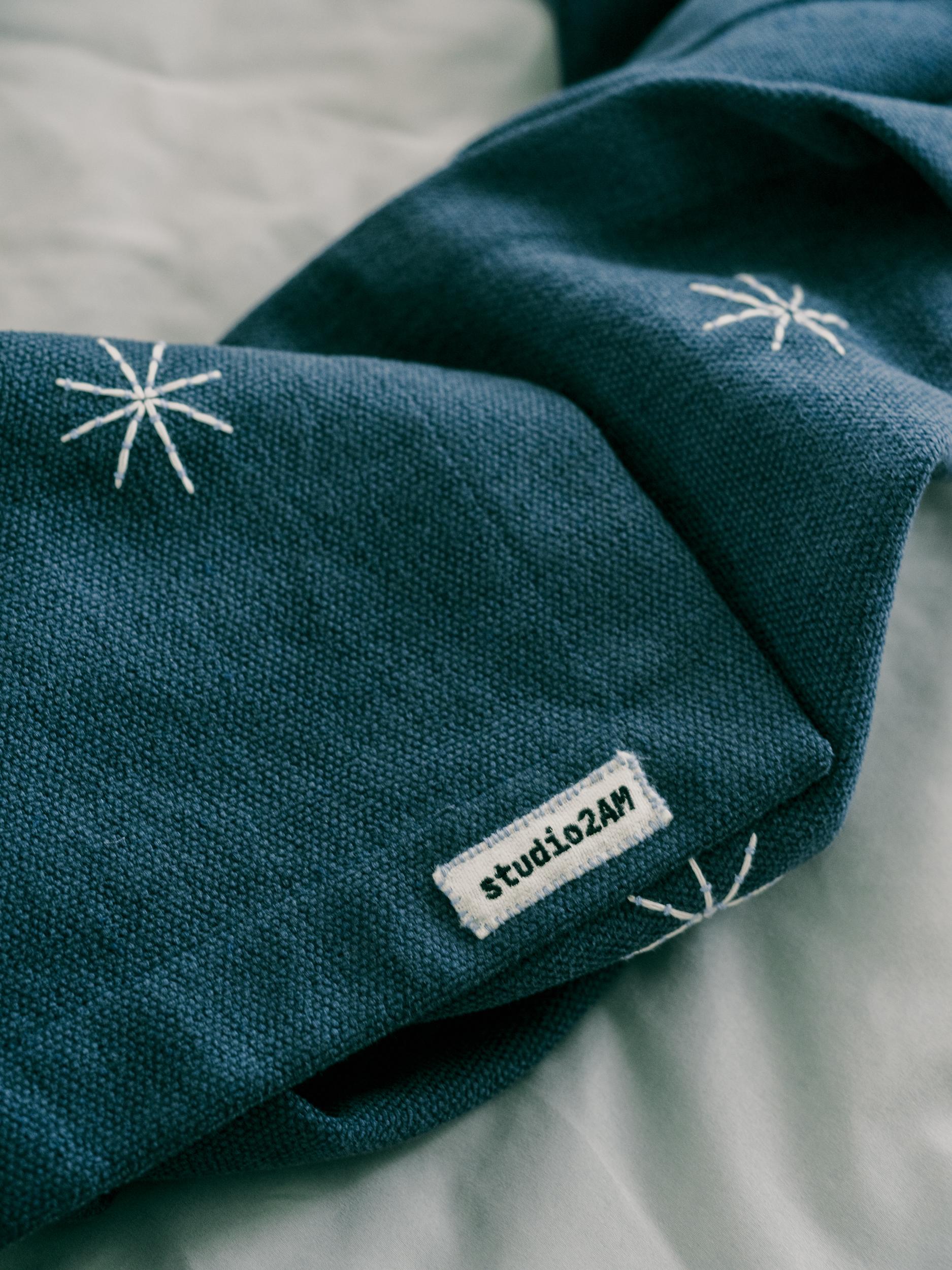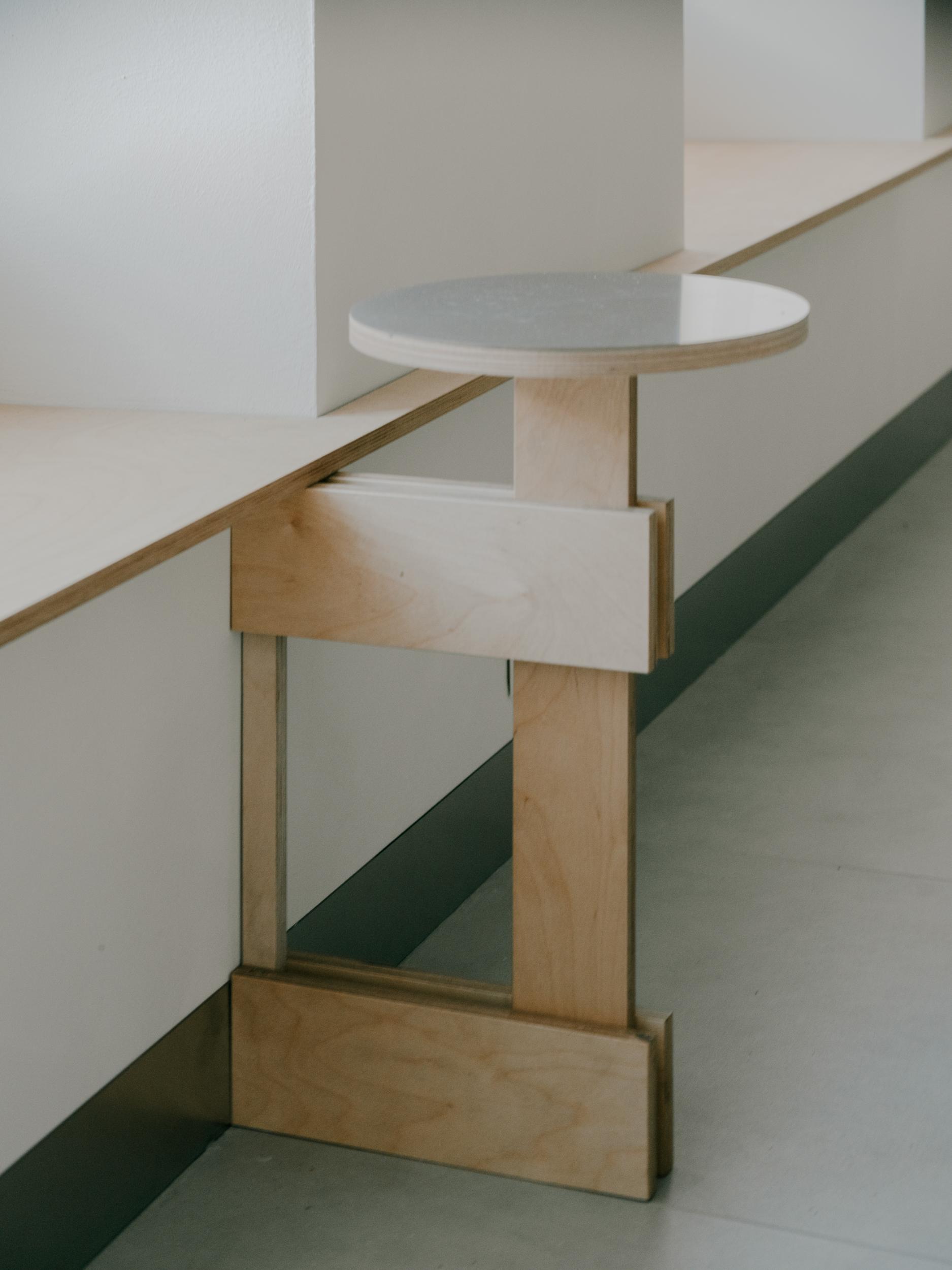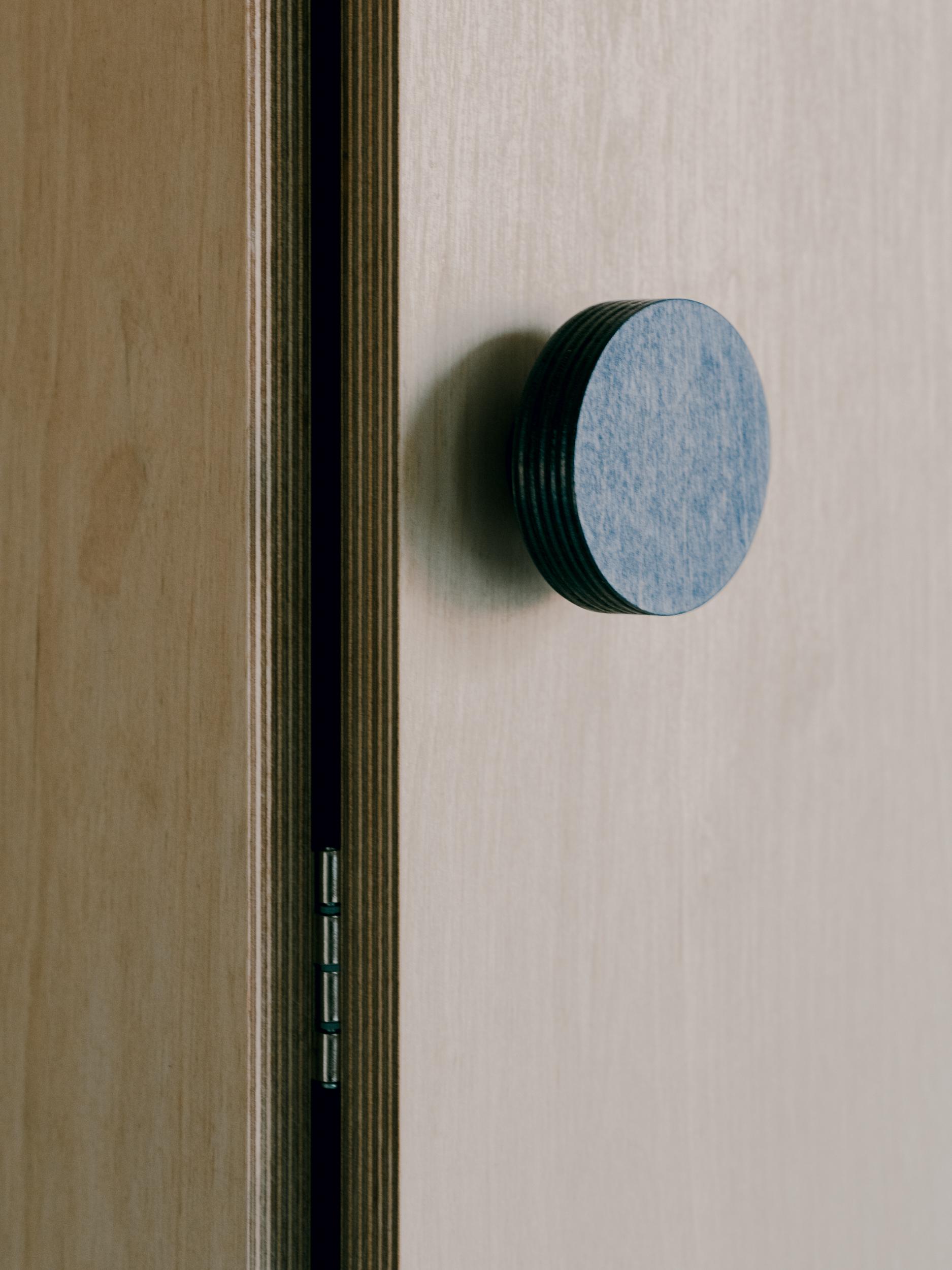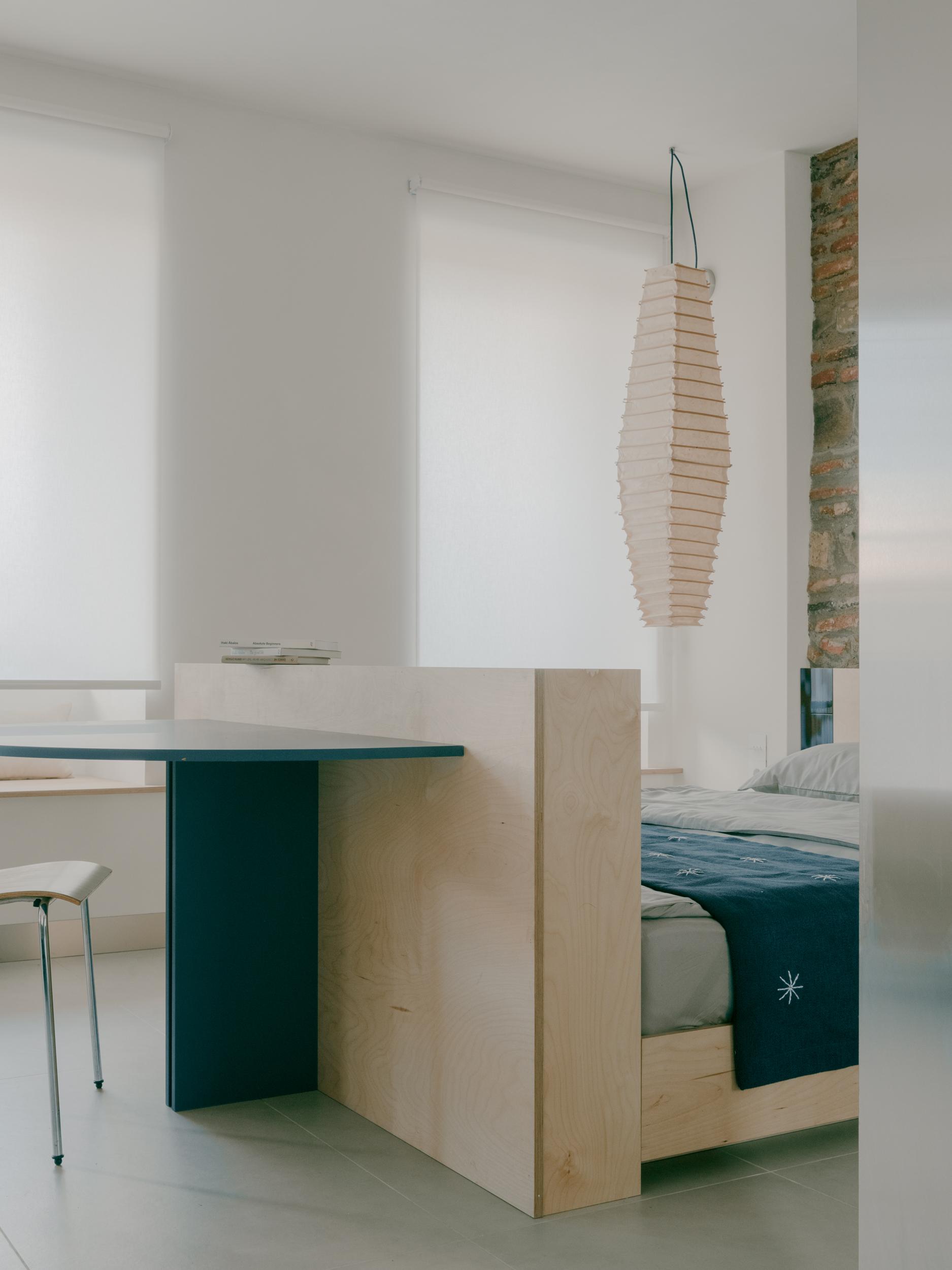 სივრცის ცენტრში განთავსებული ლურჯი მაგიდა ერთდროულად ასრულებს სამუშაო ზედაპირისა და ვიზუალური აქცენტის ფუნქციას. მისი ფერი მეორდება ინტერიერის მცირე დეტალებში — კარადის სახელურებში და საწოლთან გამოყენებული კერამიკული ფილების ელემენტებში — რაც სივრცის სხვადასხვა კომპონენტს ერთმანეთთან აკავშირებს. ლურჯი ფერის გამოყენება მხოლოდ ვიზუალურ აქცენტს არ უკავშირდება და ვრცელდება ინტერიერის ტაქტილურ თვისებებზეც. იგი იგრძნობა ფანერის სახელურებში, მაგიდის გლუვ ზედაპირში და ხელნაკეთი, ნაქარგი საწოლის გადასაფარებელში. განსხვავებული ტექსტურის მქონე ელემენტები საერთო ფერის მეშვეობით ერთიანდება და მრავალფეროვან სენსორულ გამოცდილებას ქმნის.