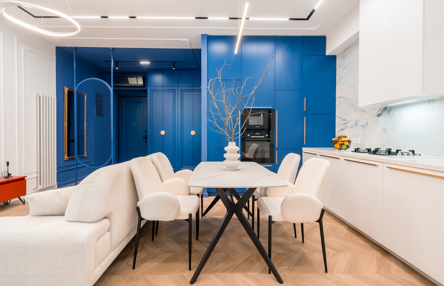 თეთრ ფერში მოწყობილ სამზარეულოს ოქროსფერი დეტალები განსაკუთრებით უხდება. აქვე კონტრასტის სახით გვხვდება ლურჯი ფერი, რომელიც სივრცეს მეტ სიღრმეს ანიჭებს.