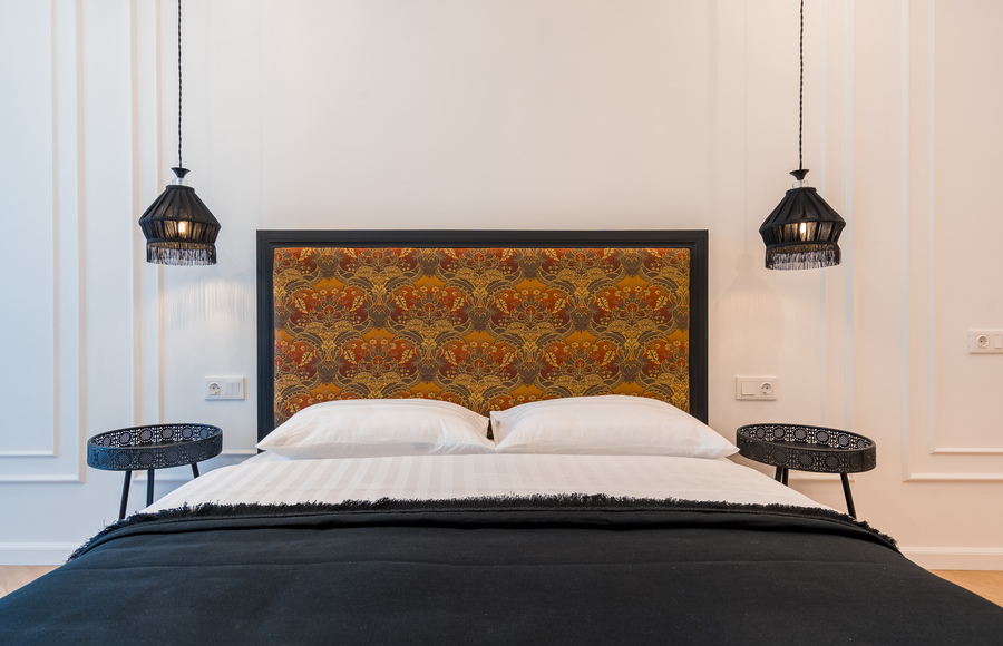 აქვე ყურადღებას იქცევს საწოლის გვერდით, ჭერზე დამონტაჟებული, შავი ფერის სანათები, რომლებიც ბინის მეპატრონემ თავად დაამზადა. სანათები ოთახში არსებულ ფერებთან კონტრასტში მოდის და ამშვენებს სივრცეს.