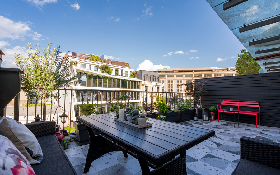 რაც შეეხება ტერასას, შავი ფერის ავეჯი და წითელი დეტალები სივრცეს საკმაოდ მიმზიდველს ხდის.