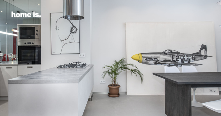 ბინა ორ ნაწილად არის გაყოფილი – საძილე და საერთო ზონები. საერთო სივრცე კი თავის მხრივ, სამი ნაწილისგან შედგება. ეს ყველაფერი კი ისეა მოწყობილი, რომ აქ არანაირი მოძრავი ან სტატიკური ტიხარი არ გვხვდება. სამზარეულო სივრცე გამოყოფილია სამუშაო კუნძულის მაგიდით, რომელზეც მოთავსებულია ქურა და ჭერზე დამონტაჟებული გამწოვი.