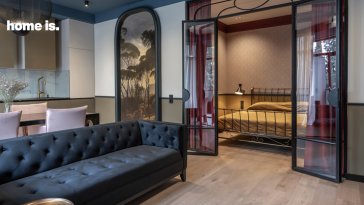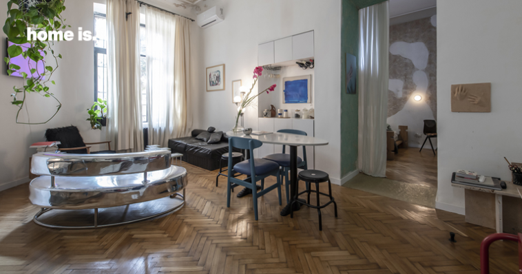 გაერთიანებული მისაღები და სამზარეულო მსუბუქი და მინიმალისტურია. სივრცეში ძველებური სტილის პარკეტი და თეთრი კედლები გვხვდება, ამიტომ აქცენტი საინტერესო დიზაინის ავეჯსა და ორიგინალურ დიზაინობიექტებზე კეთდება. ყურადღებას იქცევს თანამედროვე სტილის ვერცხლისფერი სავარძელი, დახვეწილი ფორმის პატარა სასადილო მაგიდა და ლურჯი სკამები, რომლებიც ჰარმონიულად ეხამება ცისფერ ნახატს და მიმზიდველად გამოიყურება. ავეჯის შავი და წითელი აქცენტები სივრცეს მრავალფეროვნებას მატებს, ბუნებრივი გამწვანება კი სახლს ახალი ენერგიითა და სიცოცხლით ავსებს. აღსანიშნავია, ორიგინალური დიზაინის სანათებიც, რომლებიც დეკორაციას ამდიდრებს, აქსესუარები კი ოთახს სიძველის ეფექტს სძენს.