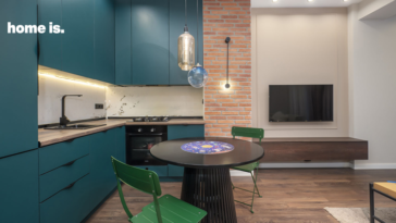 განსაკუთრებული ყურადღება მახვილდება ტელევიზორის კუთხეზე, რომელშიც კონტრასტული ფერები ერთმანეთს ორგანულად ესადაგება. ინტერიერის მთავარი ელემენტი – ლურჯი ფუნქციური ტიხარი სხვადასხვა აქსესუარითა და დიზაინ ობიექტით არის გაფორმებული და სივრცეს გამორჩეულ მომხიბვლელობას და თანამედროვე იერს სძენს. აღსანიშნავია კომფორტული ნარინჯისფერი დივანიც, რომელიც ოთახს ერთგვარად აცოცხლებს.