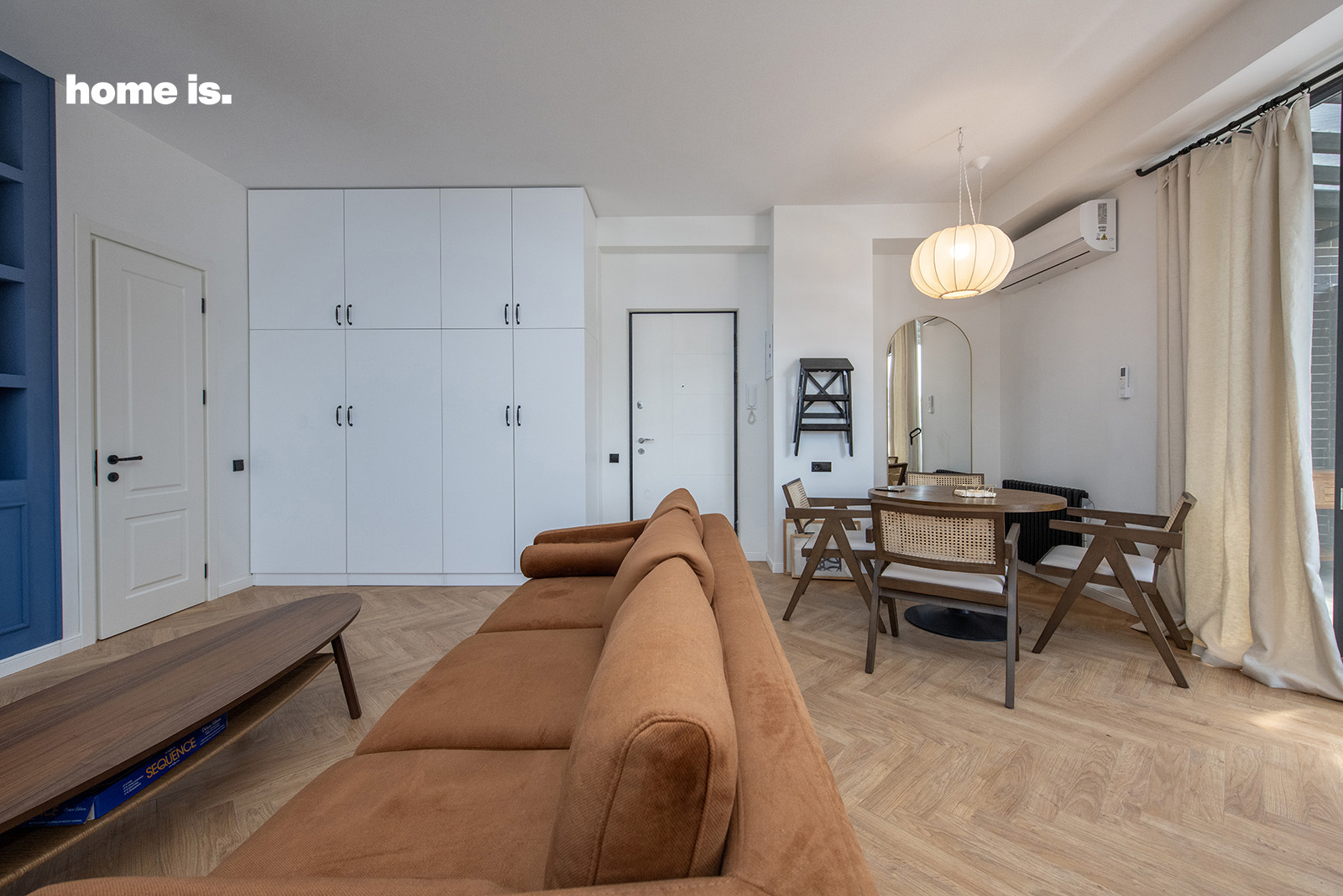 მთავარი, დიდი ოთახი სამ ნაწილად არის დაყოფილი. ბინაში შესვლისთანავე გვხვდება მთელს კედელზე დამონტაჟებული საკმაოდ ტევადი თეთრი კარადა, რომელიც კედელს ჰარმონიულად ერწყმის და ერთიანობის განცდას აძლიერებს.