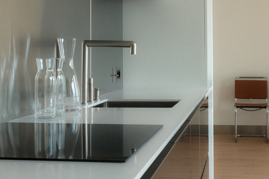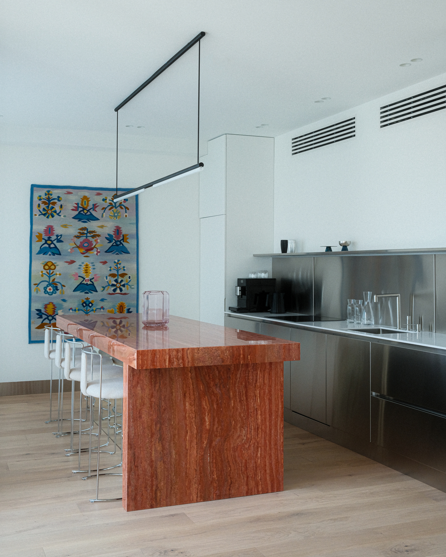 სახლში ერთ-ერთი მნიშვნელოვანი ზონა სამზარეულოა, სადაც წამყვან როლს წითელი ტრავერტინის კუნძული ასრულებს, რომელიც სარკის ბაზაზეა დამზადებული და შეკიდულ ეფექტს ქმნის. კუნძული თავად ხელოვნების ობიექტია, რომელიც განსაკუთრებულ მიმზიდველობას და ხასიათს სძენს სივრცეს, ამავდროულად კი სასადილო მაგიდის დანიშნულებას ითავსებს და საკმაოდ ფუნქციურია. უჟანგავი ფოლადის ფაქტურისგანაა დამზადებული მინიმალისტური, მცირე ზომის სამზარეულო, რომლის სათავსოები და კარადები კედელს ერწყმის და ერთ მთლიანობას ქმნის.