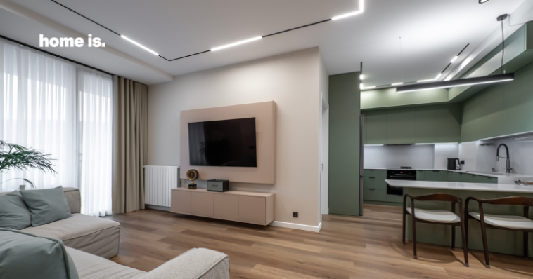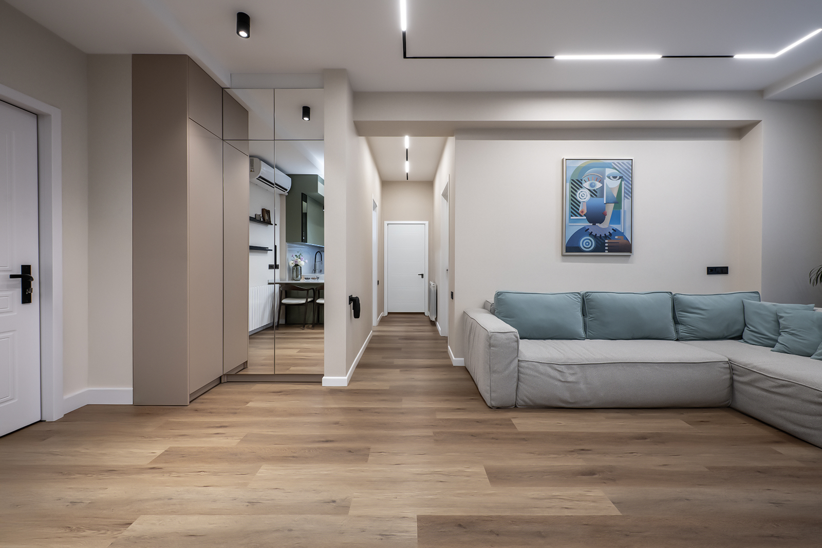 ინტერიერი სადა, კრემისფერ ტონალობაშია გადაწყვეტილი, ფერადი აქცენტები კი ავეჯის სახით შემოდის. წყალგამძლე ვინილის იატაკი, რომელიც სამზარეულოშიც გვხვდება, ბინის მთლიანობას უსვამს ხაზს. ამას გარდა, ერთიანობის შეგრძნებას აძლიერებს საგანგებოდ შერჩეული პლინტუსებიც, რომელთა გადაბმა არ ჩანს, რაც კედლებს უფრო ეფექტურს ხდის.