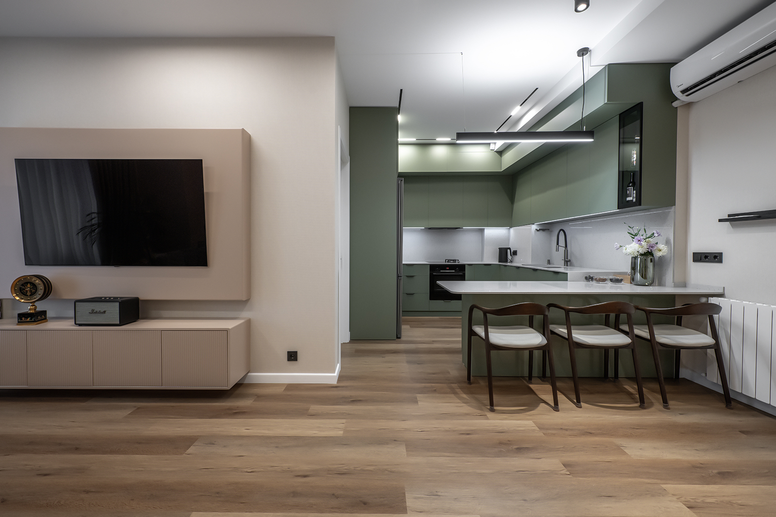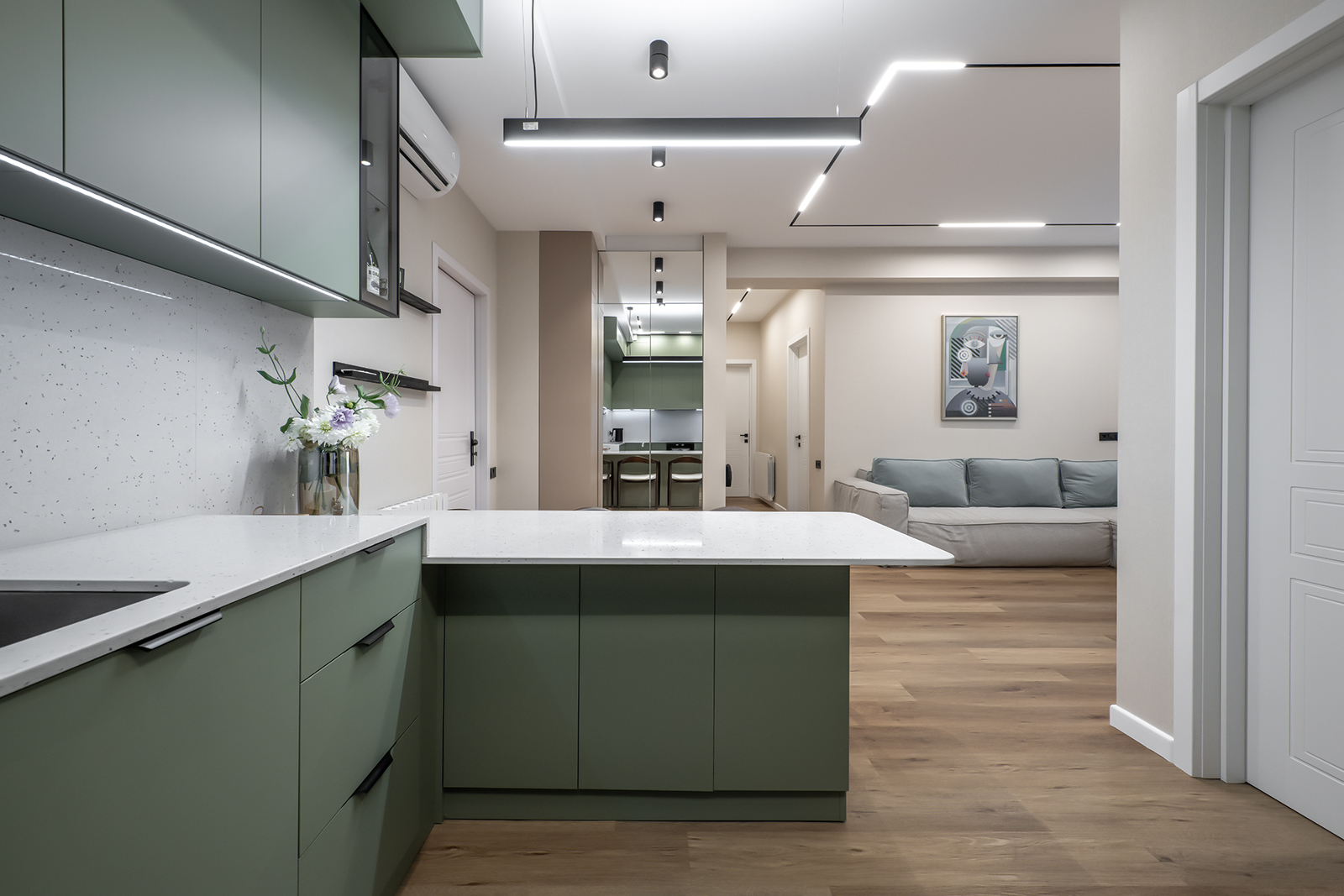 ბინაში ერთ-ერთი გამორჩეული ზონაა სამზარეულო. სამზარეულოს ავეჯი ზეთისხილისფერ ტონალობაშია გადაწყვეტილი, რაც ინტერიერს ძალიან ალამაზებს და ახალისებს. აქვე გვხვდება Kraus-ის ბრენდის ნიჟარა, სამზარეულოს ზედაპირები კი ქვით არის მოპირკეთებული. ეს კუთხე საკმაოდ ფუნქციურია, რადგან ტევადი კარადებითა და თაროებით არის დატვირთული, რომელთა მიღმა ჭურჭელი, საჭირო ნივთები და ინვენტარია მოქცეული. სამზარეულოს კუნძული სადა და მინიმალისტურია, ის ერთი მხრივ, მიჯნავს შემოსასვლელ და სამზარეულო ზონას ერთმანეთისგან, მეორე მხრივ კი სასადილო მაგიდის ფუნქციას ითავსებს.