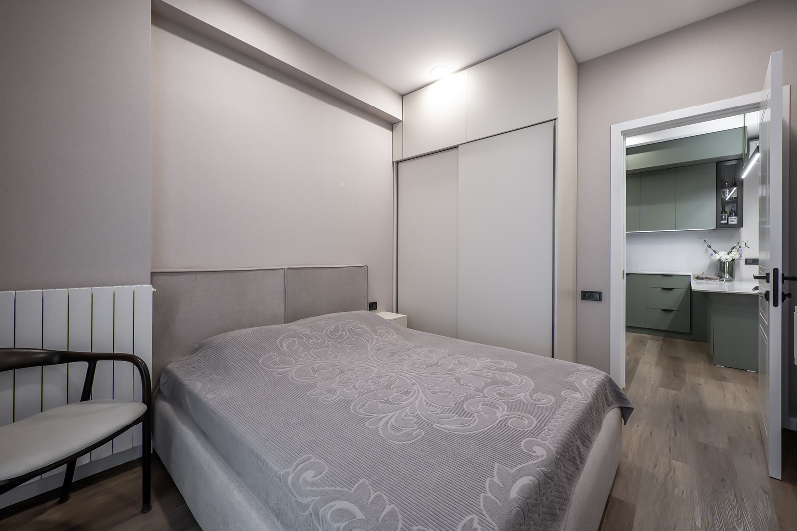 მესამე საძინებელი შედარებით სადა და მოკრძალებულია. ამ შემთხვევაშიც უმეტესად კრემისფერ და ნაცრისფერ ტონებს ვხვდებით. ფართობის სიმცირის მიუხედავად, ეს სივრცეც საკმაოდ ფუნქციურია.