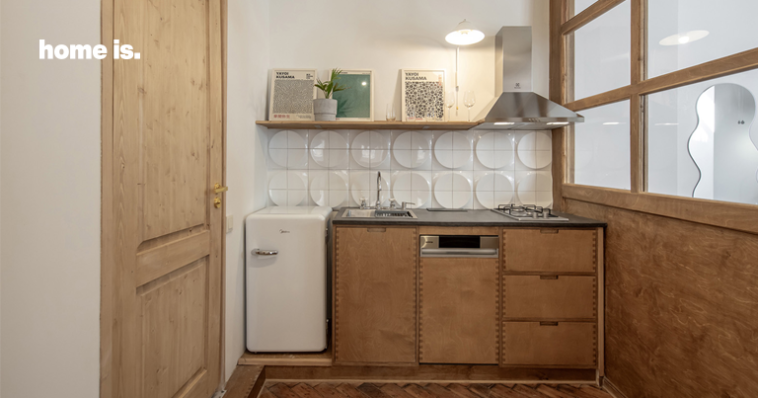 სამზარეულოს ზონა საკმაოდ მცირე ადგილს იკავებს, თუმცა მიუხედავად ამისა, ფუნქციურად სწორად არის გადანაწილებული და ერგონომიულ, კომფორტულ პირობებს უზრუნველყოფს. ამ ოთახშიც მთავარ როლს ხის მასალა ასრულებს, რომელიც სამზარეულოს თითქმის ყველა დეტალში ვლინდება. ყურადღებას იქცევს “Peronda”-ს ბრენდის ფილები (“bowl”), რომელიც სამზარეულოს წინსაფარზე გვხვდება. ამ ფილების დახმარებით შესაძლებელია სხვადასხვა გეომეტრიული ფიგურების შექმნა და სივრცისთვის სახასიათო, ინდივიდუალური შტრიხების მინიჭება.