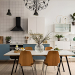 სასადილო ზონა მინიმალისტურადაა გაფორმებული, სადაც ხის მცირე ზომის მაგიდა და ღია ნარინჯისფერი სკამებია განლაგებული. სასადილოსა და მისაღები სივრცეების გამყოფ ადგილას მოთავსებულია მწვანე ფერის კარადაც, რომელიც სათავსოს ფუნქციის გარდა, დეკორატიულ როლსაც ითავსებს, რადგან ინტერიერს ფერადოვანს ხდის და მას პოზიტიურ შტრიხებს სძენს.