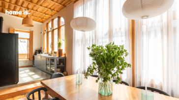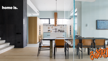 ღია გეგმარებით ხასიათდება გაერთიანებული მისაღები და სასადილო ზონა. მათ შორის გამყოფ ზოლს კი ფუნქციური კარადა წარმოადგენს, რომელიც ტევადი სათავსოს როლს ასრულებს. ინტერიერი ღია თეთრ ტონალობაშია გადაწყვეტილი, რომელშიც დომინანტურ როლს ხის მასალა ასრულებს. იატაკი, ჭერის სვეტები, ფანჯრები, ავეჯი სწორედ ხის ელემენტებით არის შესრულებული, რაც ბინას მყუდროებას, სითბოსა და სასიამოვნო ატმოსფეროს სძენს. ამ აურას დიდი ვიტრაჟები და უხვად შემოსული ბუნებრივი სინათლე აძლიერებს და საცხოვრებელს მზის შუქით ავსებს.