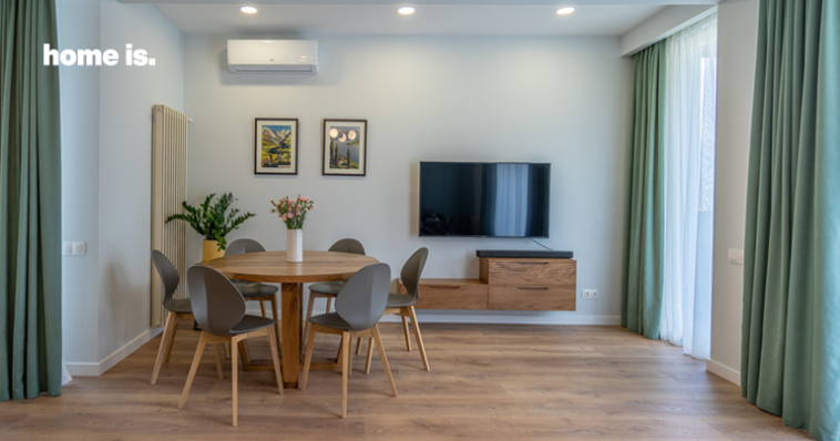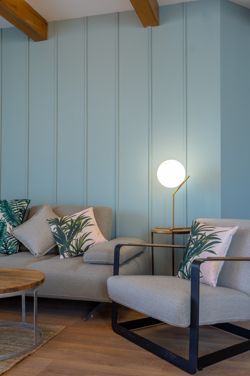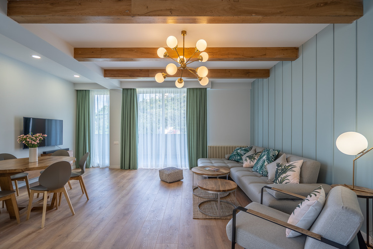 მისაღებ ოთახს კიდევ უფრო საინტერესოს ხდის ხელოვნურად დამზადებული ხის კოჭები, რასაც სივრცეში ოდნავ სიძველისა და სიმყუდროვის შეგრძნება შემოაქვს.