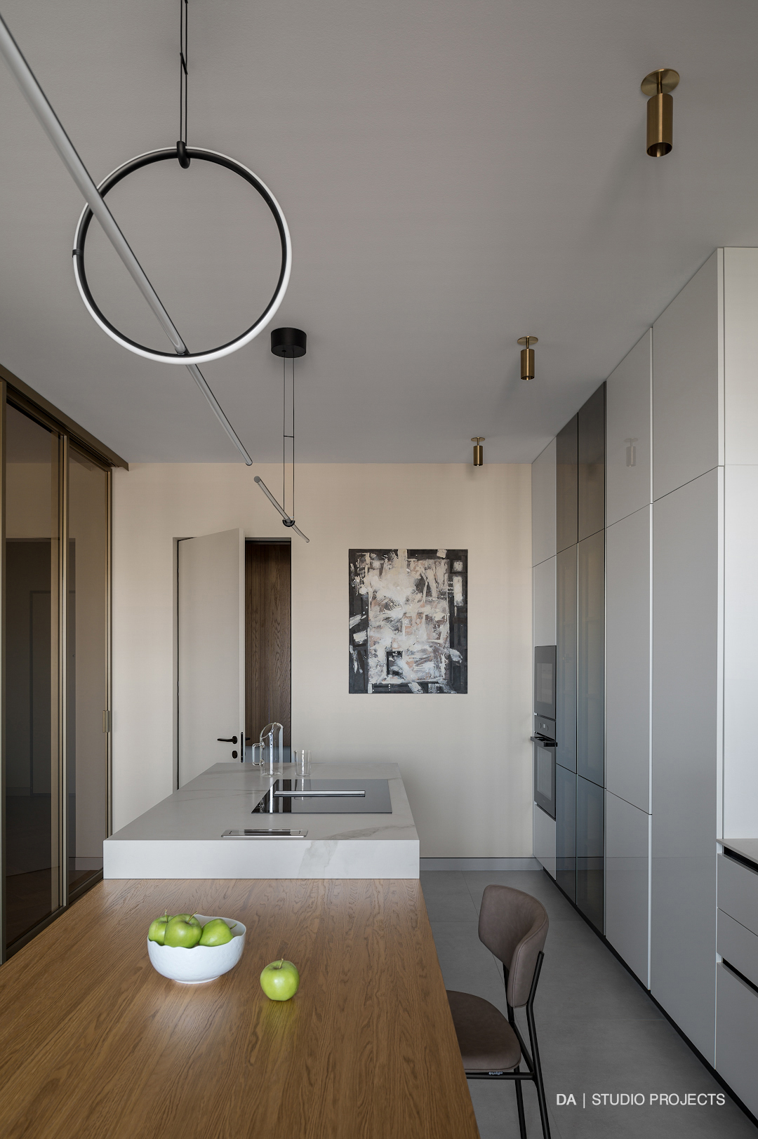 მისაღებ და სამზარეულო ზონებს ერთმანეთისგან ყოფს მოძრავი კარი, რაც საშუალებას იძლევა, ერთი მხრივ, სივრცე იყოს მაქსიმალურად გახსნილი, ხოლო საჭიროების შემთხვევაში – იზოლირებული.