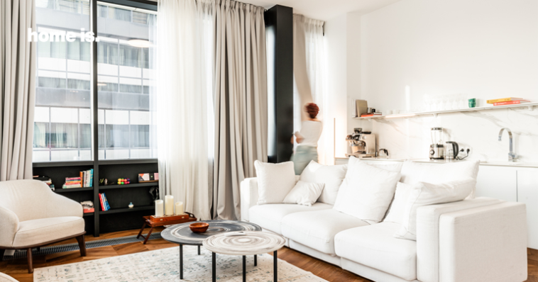 სახლში წამყვან ფერად თეთრი ტონებია გამოყენებული, რაც ბინას სინათლითა და ცოცხალი ენერგიით ავსებს. ღია გეგმარების წყალობით, მისაღები, სამზარეულო და საძინებელი ზონა გაერთიანებულია. სამზარეულო საკმაოდ მინიმალისტურია. ის წარმოდგენილია შეღებილი მინის ფასადითა და თხელი ნეოლითის ზედაპირით, რომელიც სამზარეულოს წინსაფარზე და თაროზე მეორდება. სამზარეულოში გამოყენებული „Stoca“-ს ბრენდის ავეჯი, რომელიც შუშის ფასადებისა და ნეოლითის კომბინაციებითაა ცნობილი, ინტერიერს ჰარმონიულად ერწყმის და მას მომხიბვლელობას სძენს.