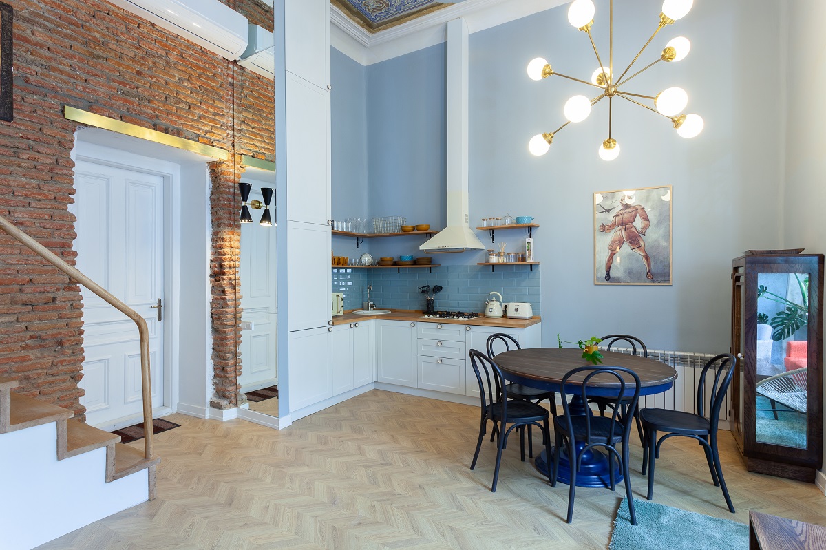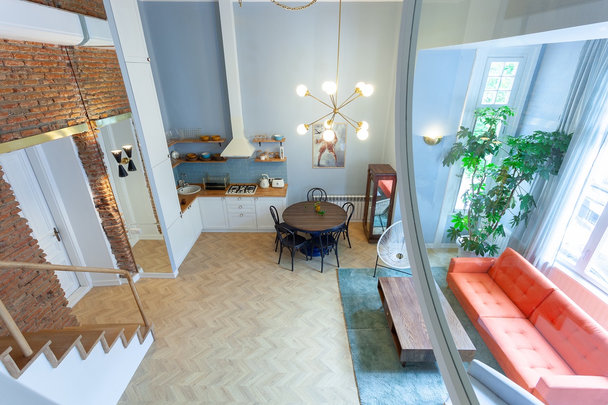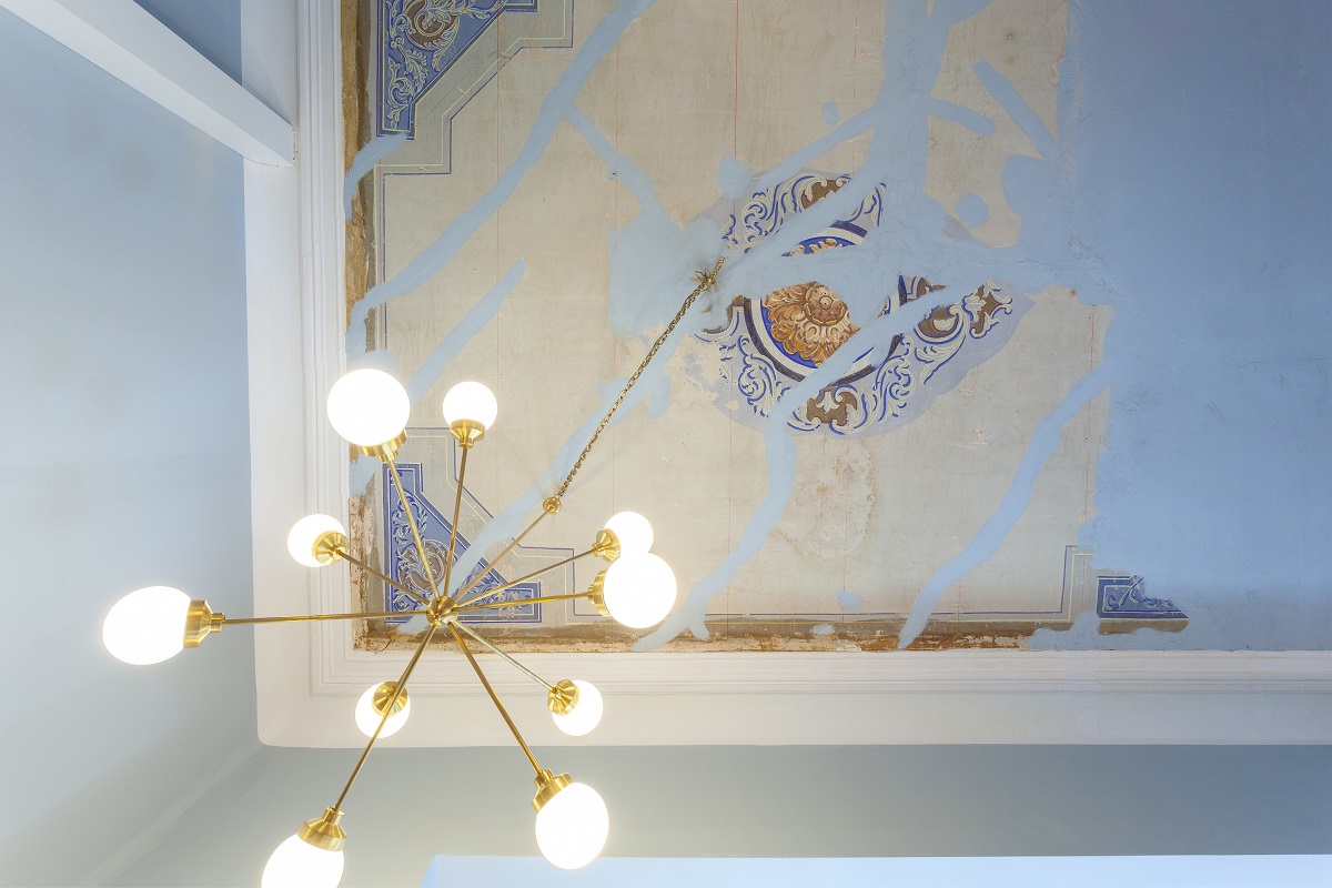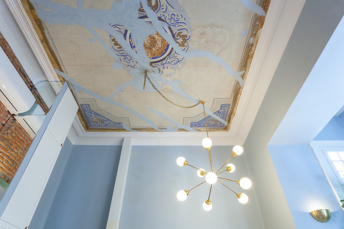 როგორც პროექტის ავტორი, დოდოშკა ჩხეიძე ამბობს, თავდაპირველად იგეგმებოდა კედლების სრულად თეთრ ფერში გადაწყვეტა. თუმცა, მოგვიანებით, დემონტაჟის პროცესში სამუშაო ჯგუფმა აღმოაჩინა ულამაზესად მოხატული ჭერი, რომელმაც დიზაინერს ზუსტად უკარნახა თუ რა ფერები უნდა ყოფილიყო გამოყენებული ინტერიერში. სწორედ ასე იქცა ლურჯის ღია ტონი აღნიშნული ბინის დომინანტ ფერად.